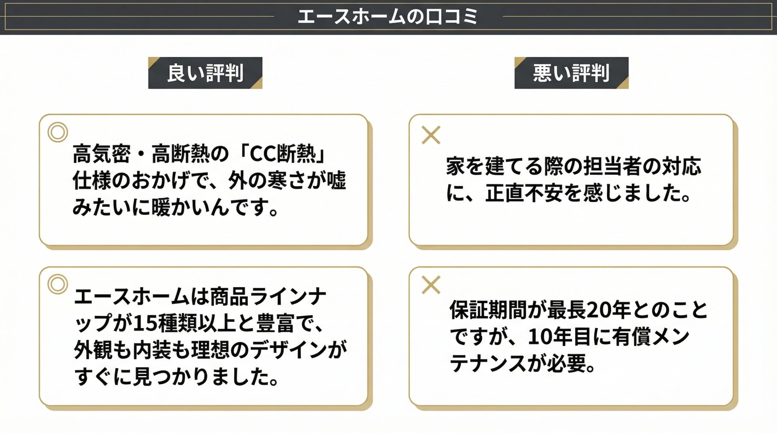 上記でも挙げたように、エースホームには、様々な口コミがあります。ここでは、それらをまとめて分析しながら、では実際エースホームの実態はどうなのかを検証していきます。