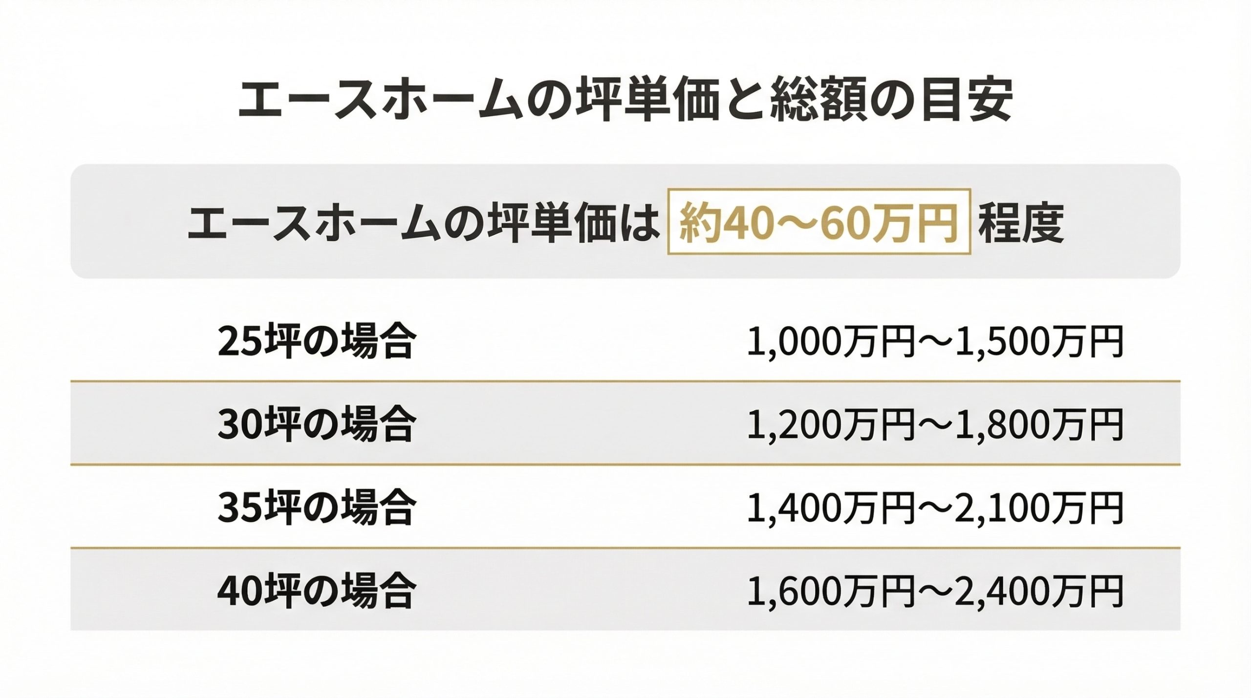 エースホームの坪単価は約40~60万円程度であり、ローコストハウスメーカーの中では中程度の価格帯に位置しています。 この価格帯は、ミサワホームや住友林業などの大手ハウスメーカー(坪単価目安85万円程度)と比較すると、1坪あたり25~45万円ほど安く、30坪の家を建てると1,000万円以上の差が生じる場合もあります。