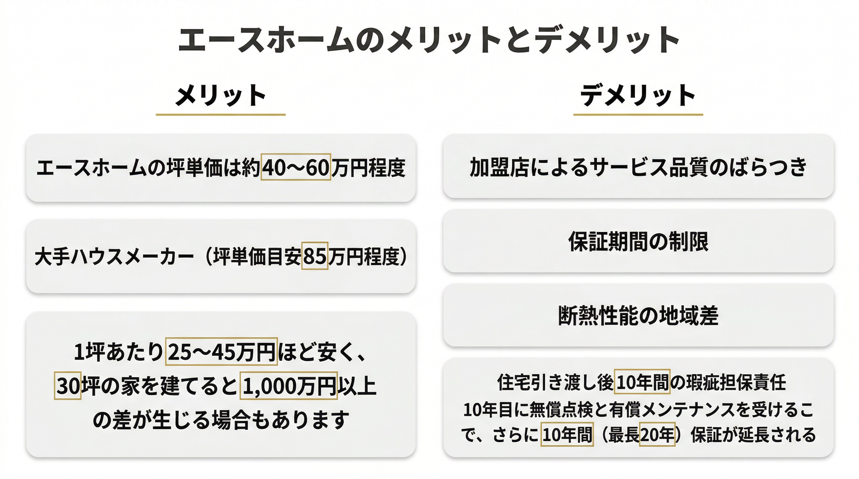 魅力的な点が多いエースホームですが、いくつかの課題や注意点も存在します。住宅選びの際には、これらのデメリットも十分に考慮する必要があります。