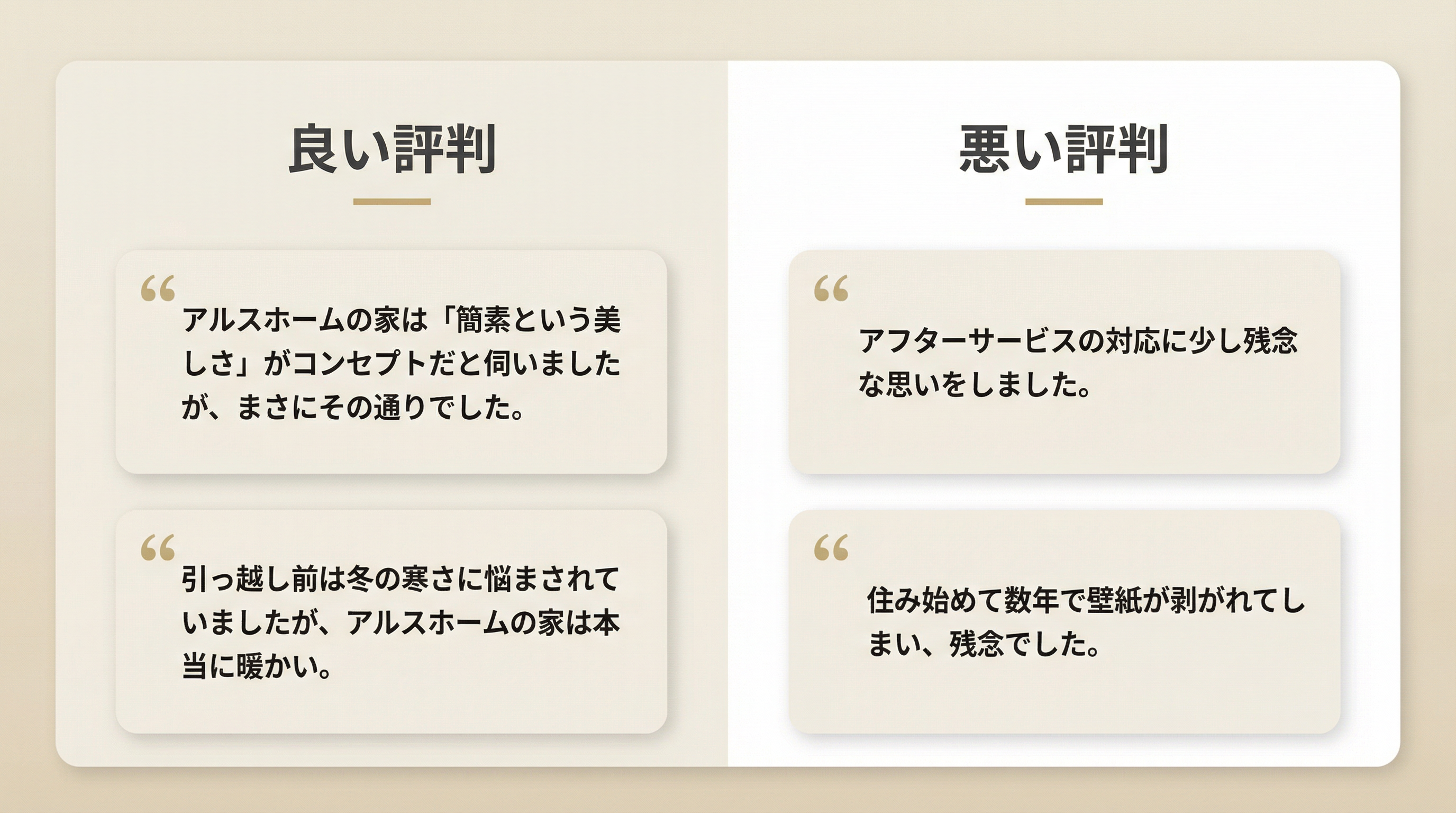 アルスホームで実際に家を建てた人の評判は気になりますよね?ネット上でも様々な意見が見られます。