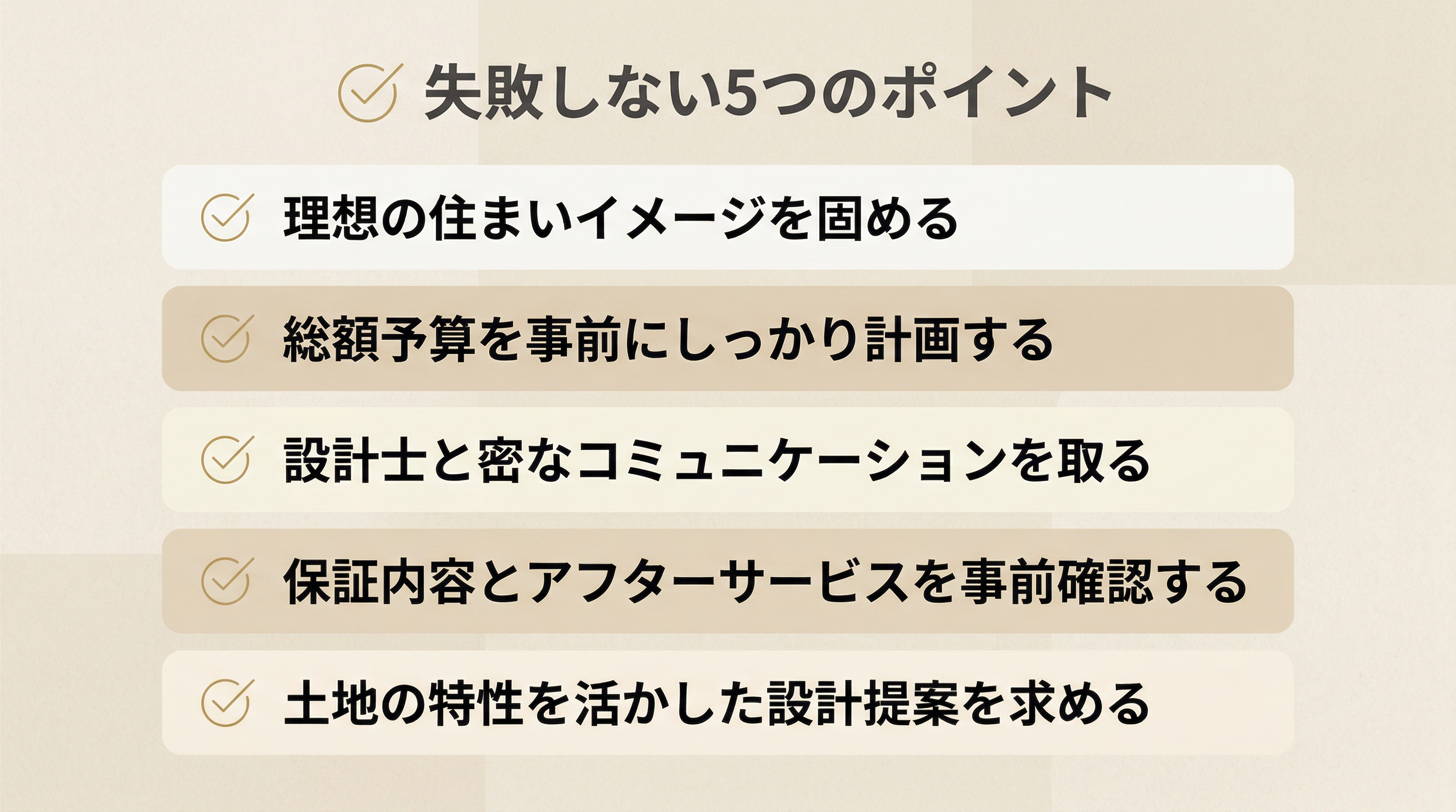 家づくりは一生に一度の大きなイベント。後悔のない選択をするために、以下の5つのポイントを参考に、家づくりを進めていきましょう。