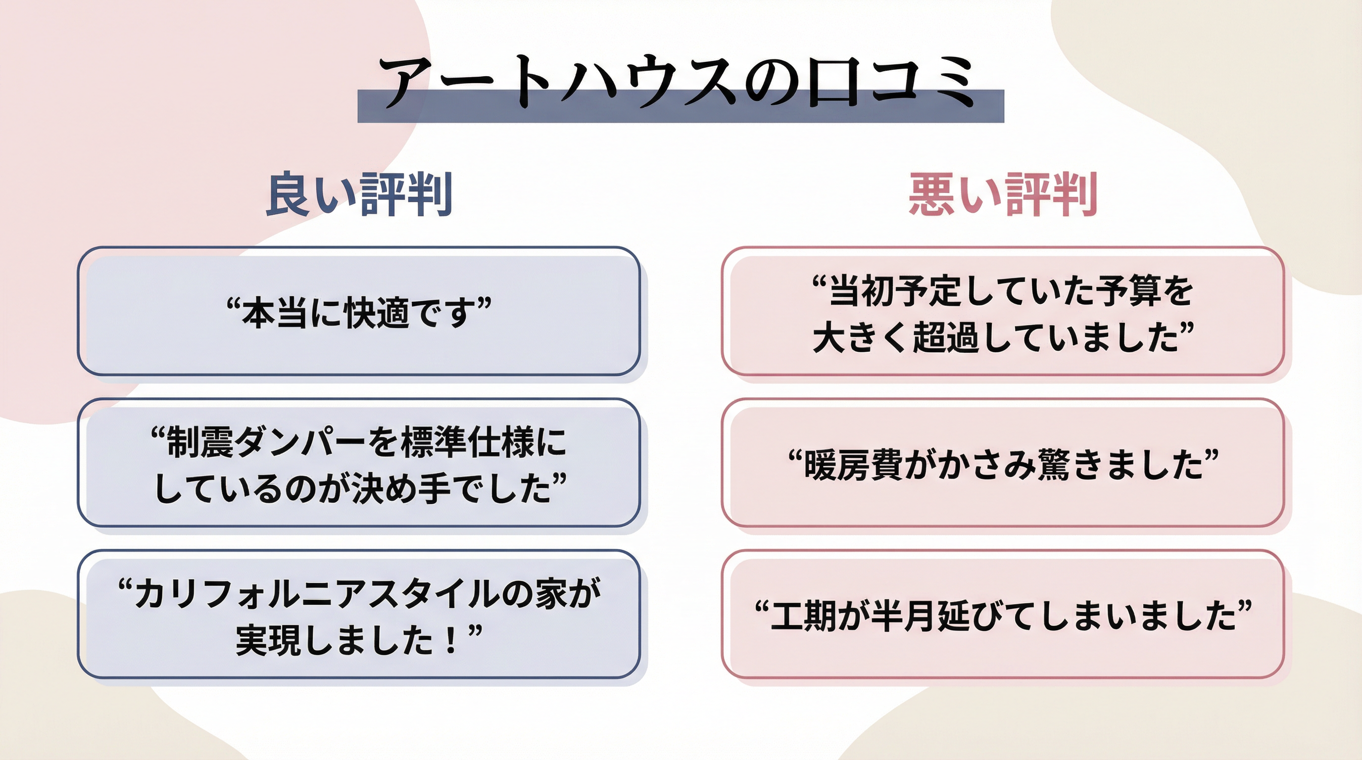 アートハウスで実際に家を建てた人の評判は気になりますよね?ネット上でも様々な意見が見られます。