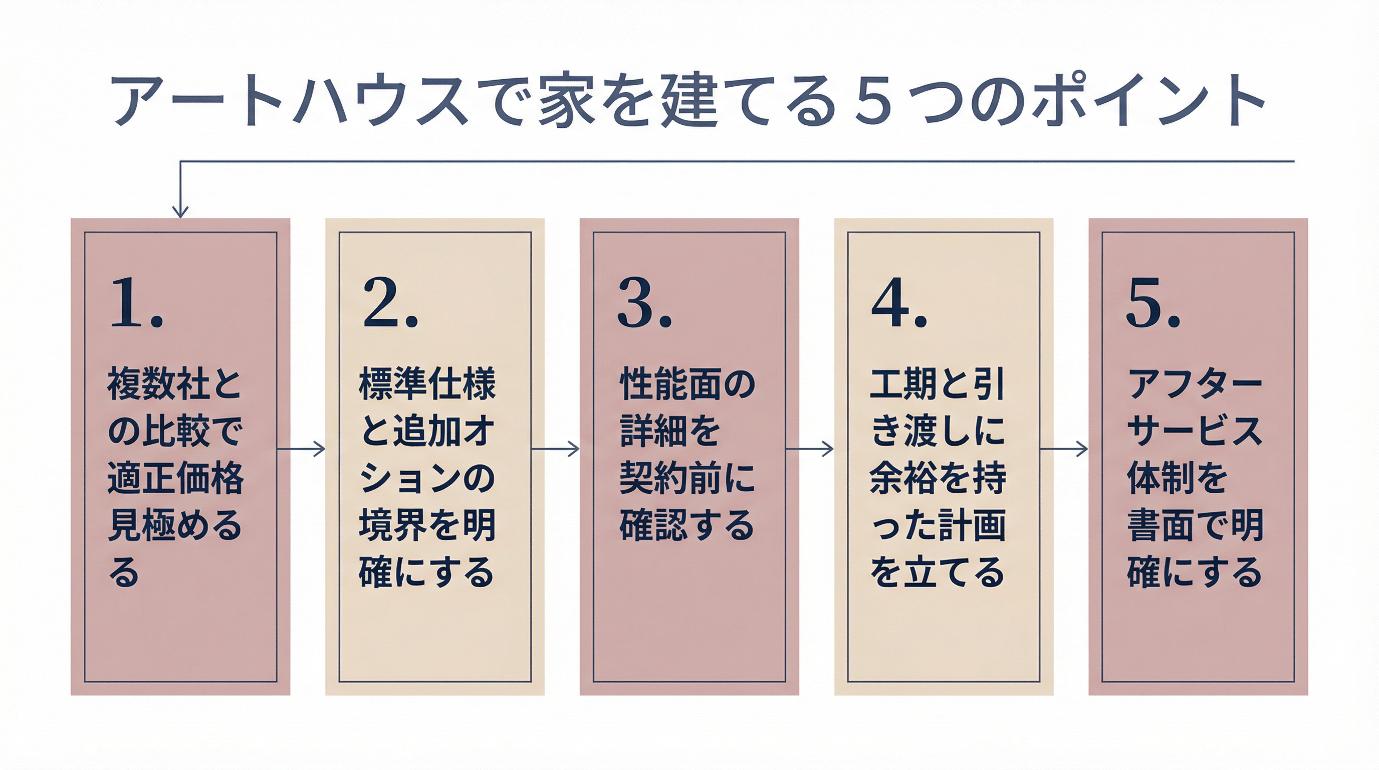 アートハウスは、デザインと性能の両立を求め、時間をかけて理想の家を追求したい方には最適な選択肢です。一方で、効率性や予算の確実性を優先する方には、他の選択肢も含めて慎重に検討することをおすすめします。