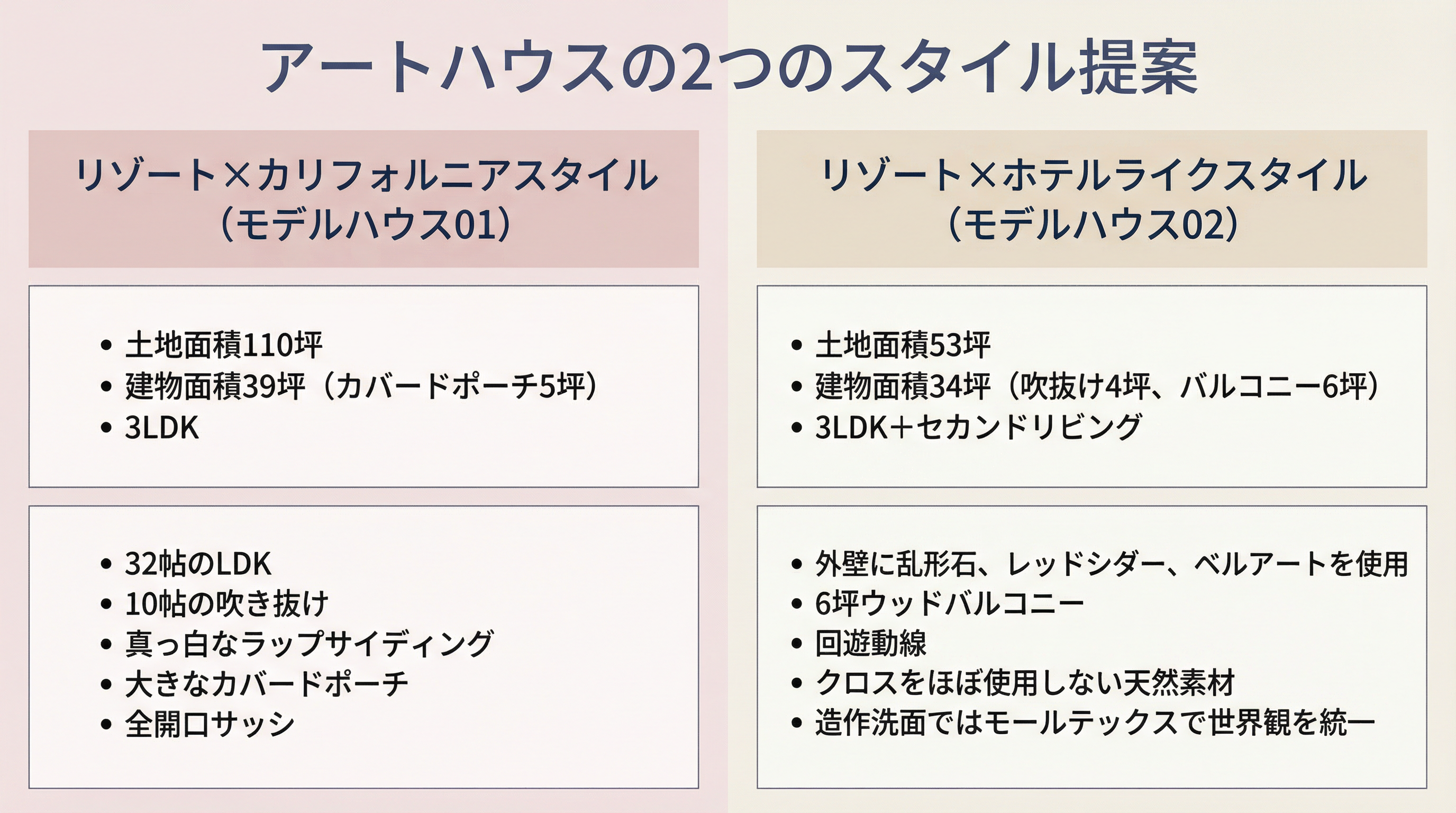 モールテックスや天然素材など、時間とともに味わいが増す素材を使った家づくりを希望する方に向いています。既製品のクロスではなく、自然素材の風合いや質感にこだわりたい方、住むほどに愛着が深まる家を求める方には、アートハウスの提案が響くでしょう。