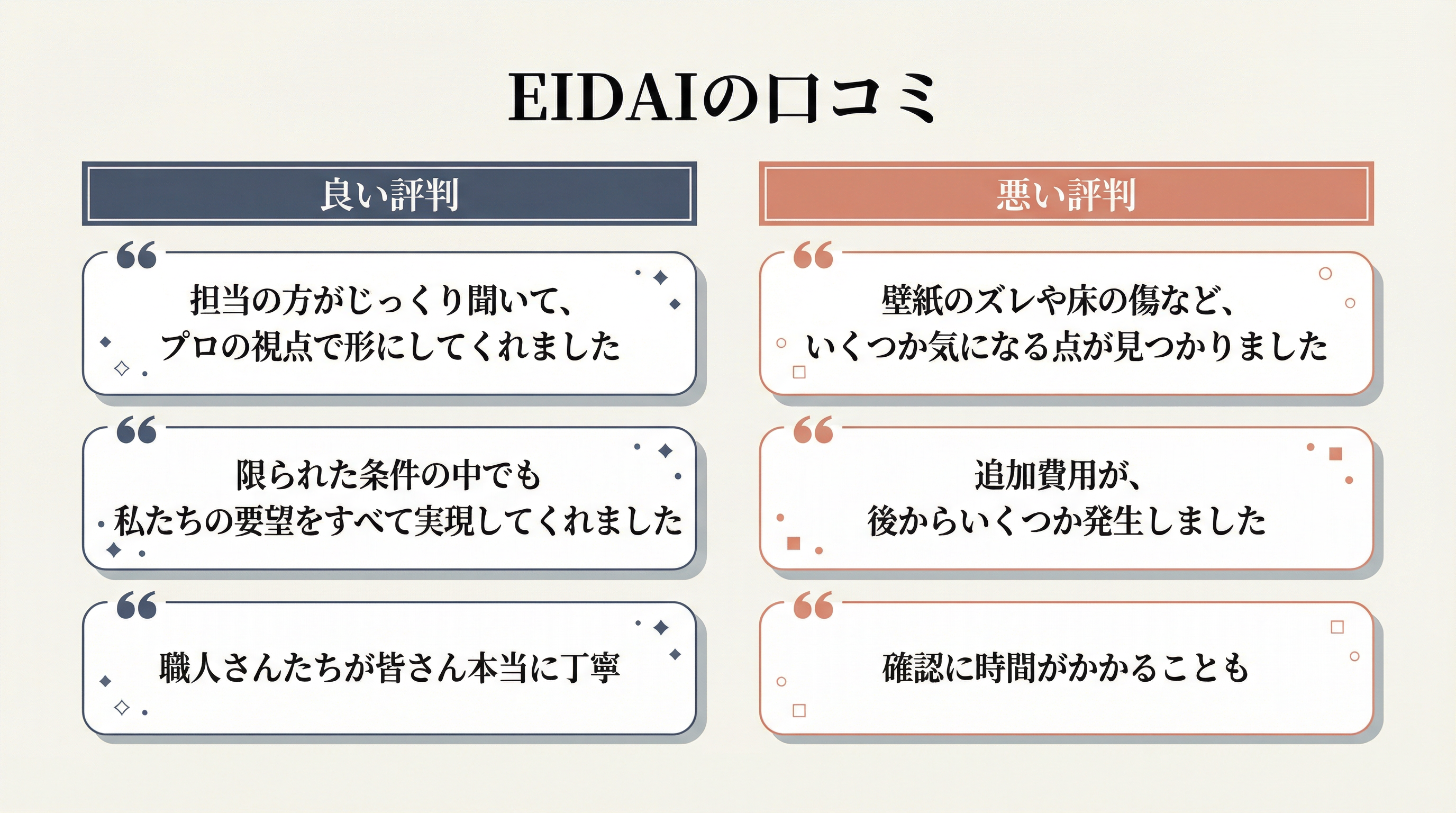 引き渡し前の細部の仕上がりチェックは非常に重要です。EIDAIは対応の早さがある一方、初期品質に不安が残るケースも稀にあるようです。