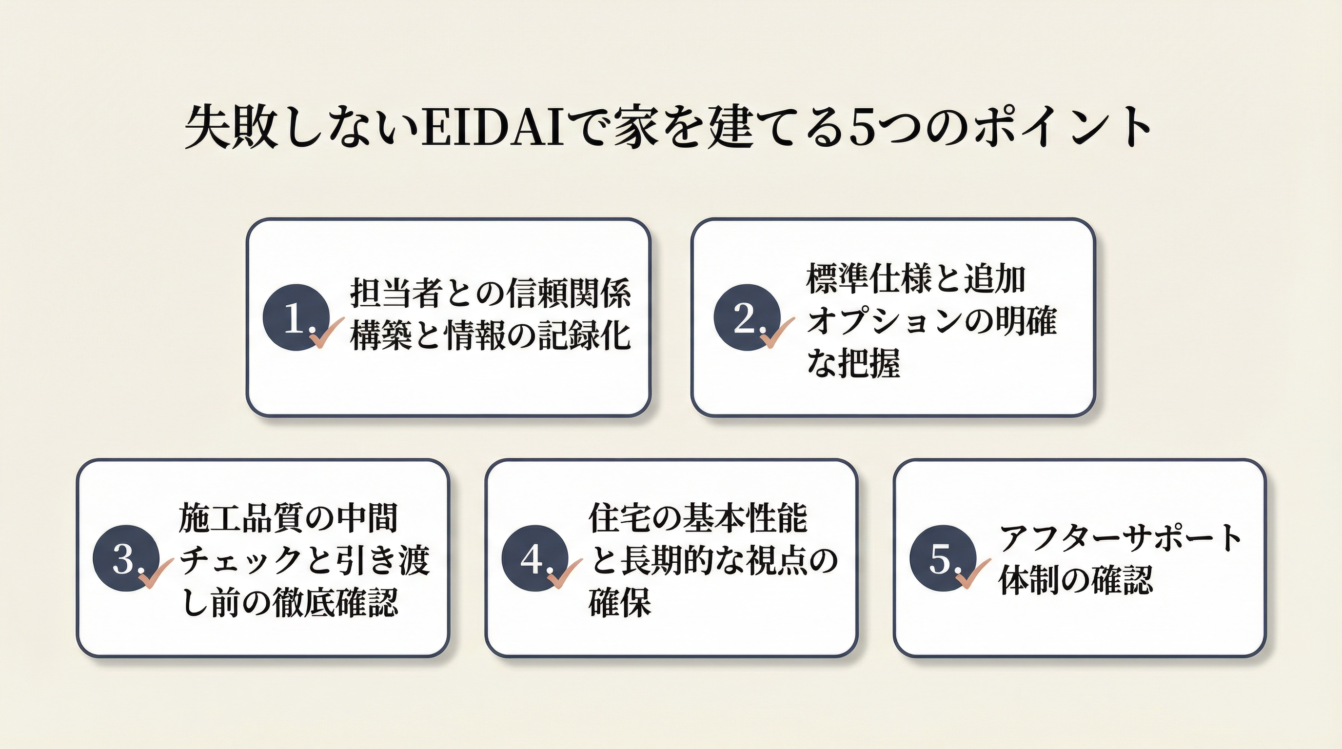 家づくりは一生に一度の大きなイベント。後悔のない選択をするために、以下の5つのポイントを参考に、家づくりを進めていきましょう。