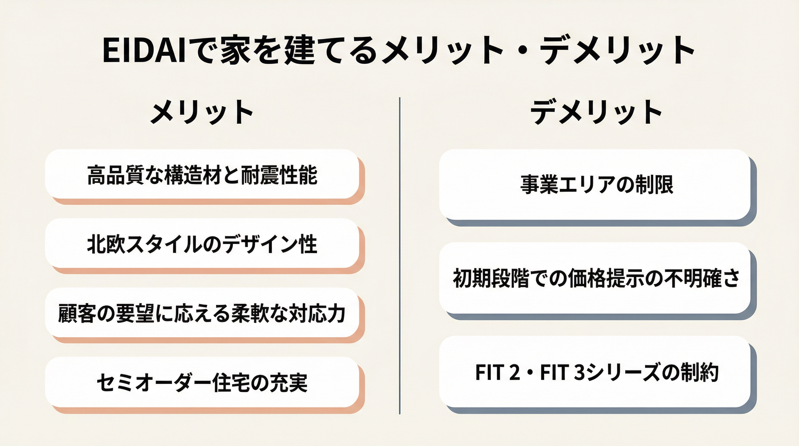 どの住宅メーカーにも課題点はあります。EIDAIについても、特定のニーズを持つ購入者にとっては検討すべき点がいくつか存在します。