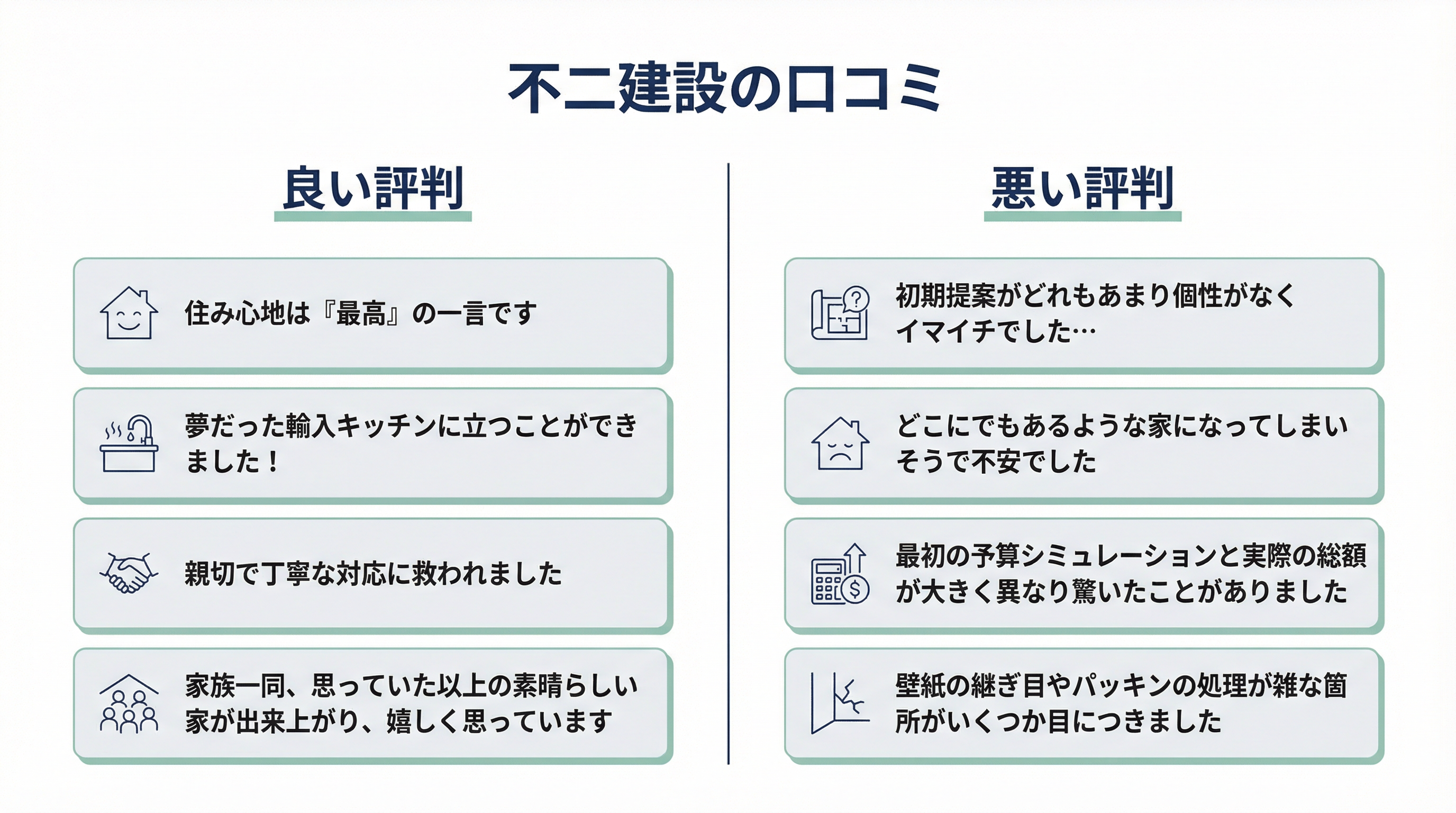 不二建設で実際に家を建てた人の評判は気になりますよね?ネット上でも様々な意見が見られます。