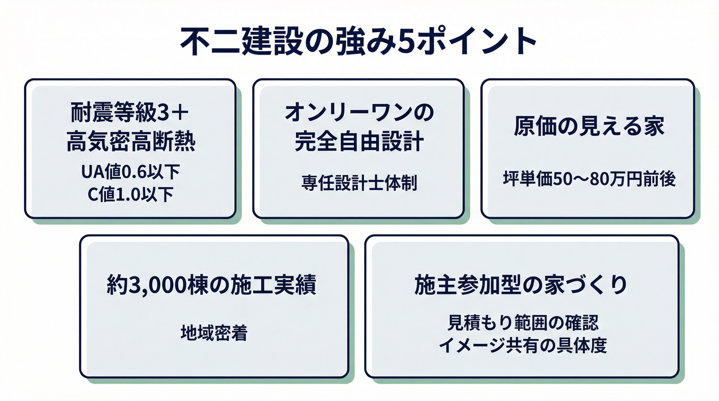 不二建設は、「耐震等級3+長期優良住宅仕様」「ZEH基準を満たす断熱性能(UA値0.6以下目標、C値1.0以下)」といったハイレベルな住宅性能を標準クラスで押さえつつ、坪単価50〜80万円台という価格帯で提供している、性能重視派にとって非常にコスパの高い工務店です。