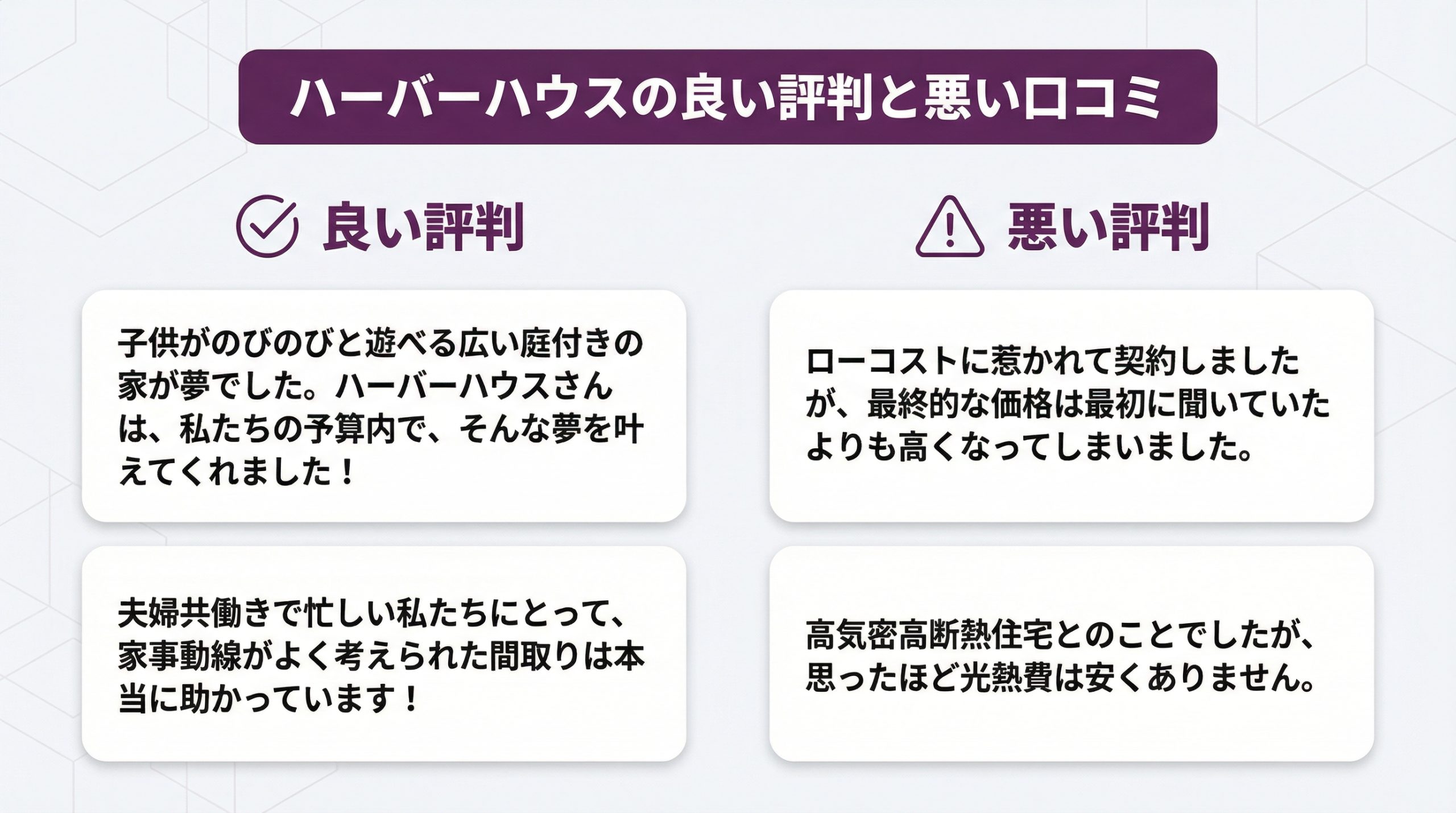 ハーバーハウスで実際に家を建てた人の評判は気になりますよね?ネット上でも様々な意見が見られます。