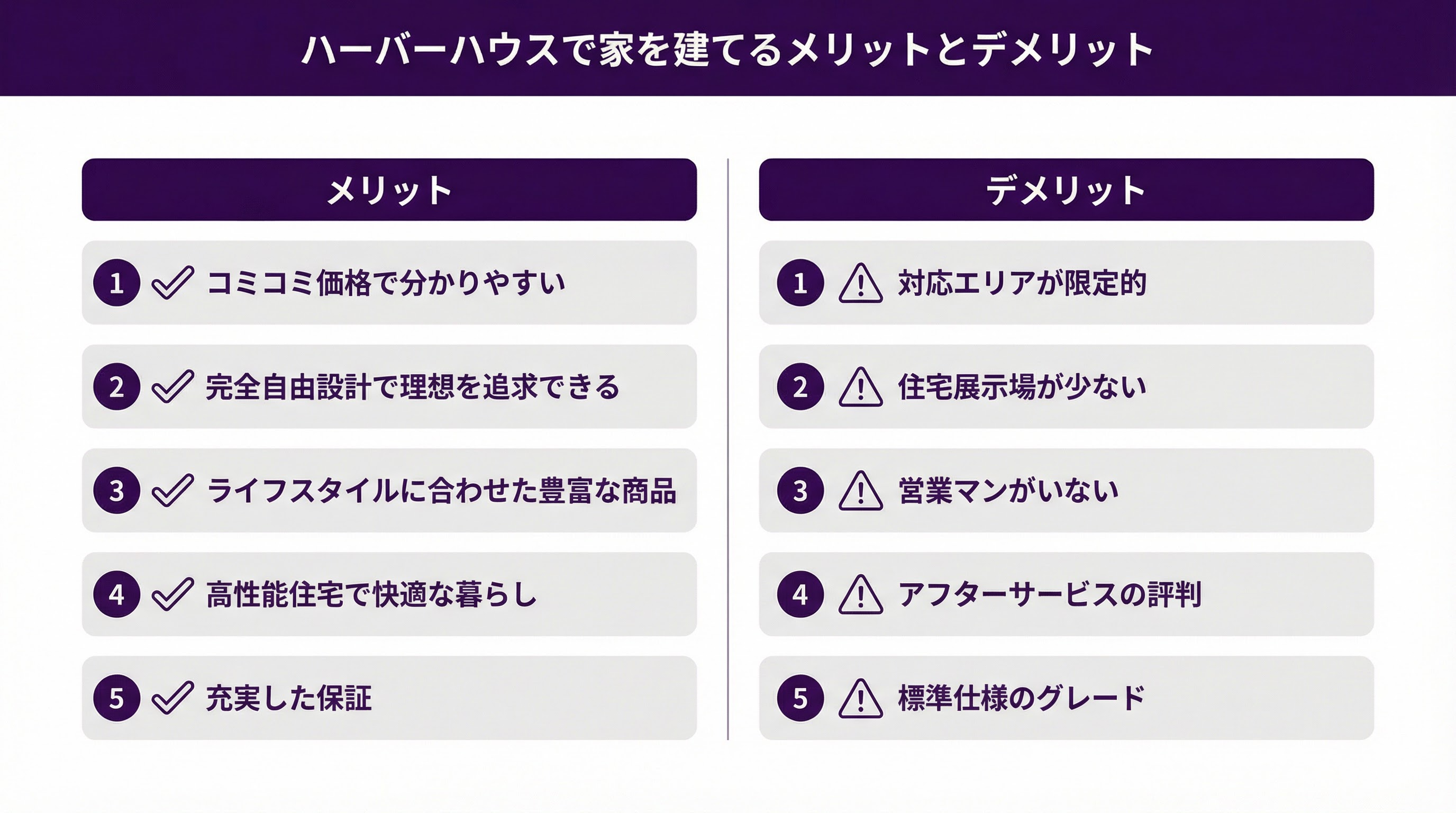 ハーバーハウスは、 家づくりにおいて価格の透明性と自由度の高さを重視する方には魅力的な選択肢となりえますが、一方で注意すべき点もいくつか存在します。