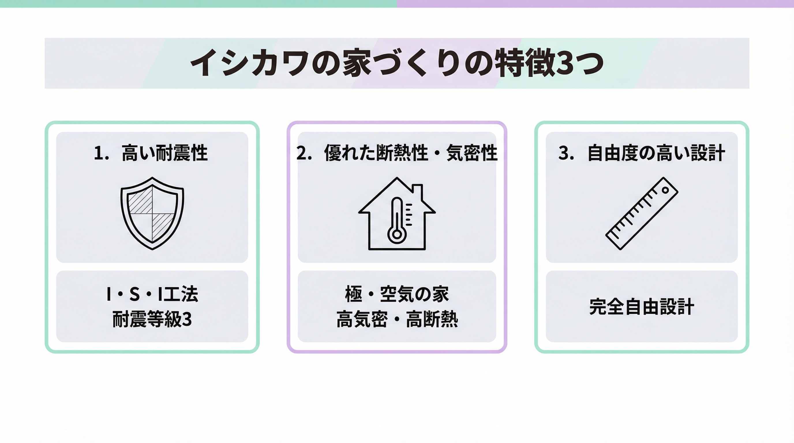 イシカワの家づくりは、以下の3つの特徴を柱としています。