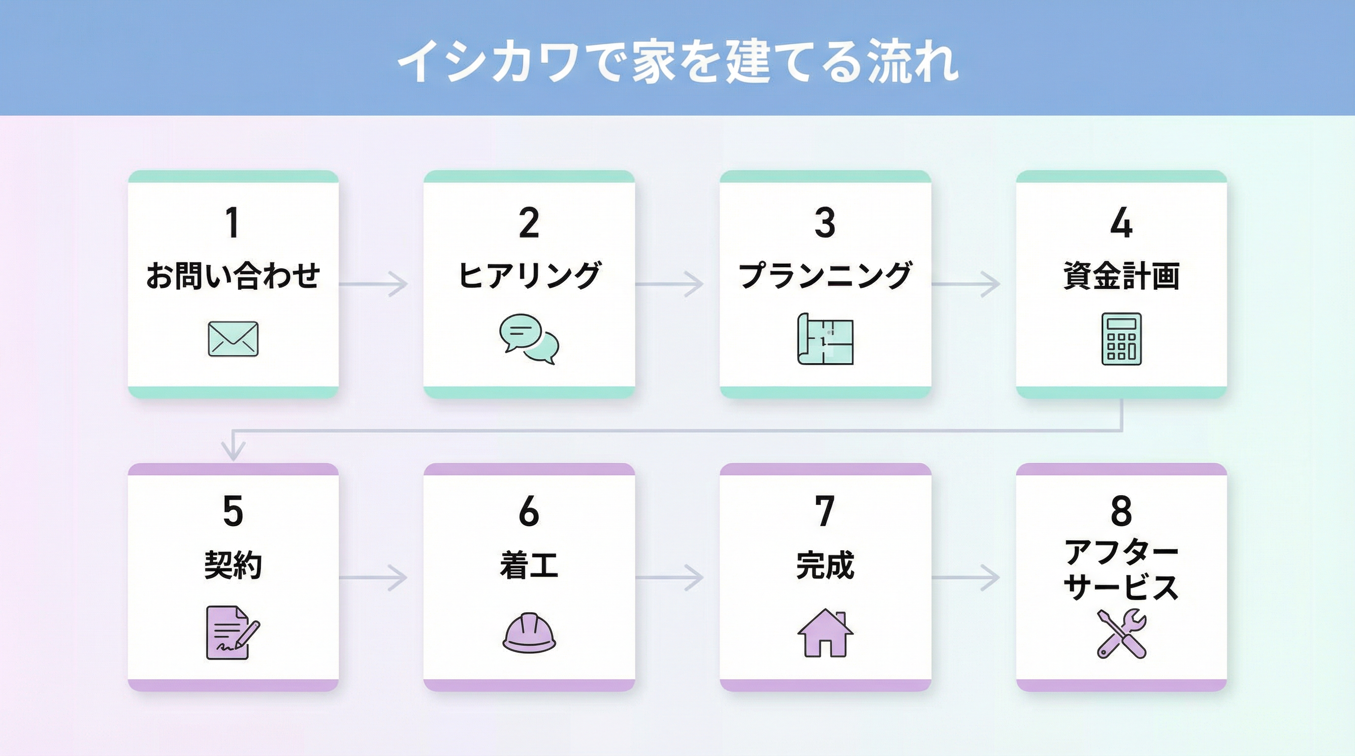イシカワで家を建てる際の基本的な流れは以下の通りです。