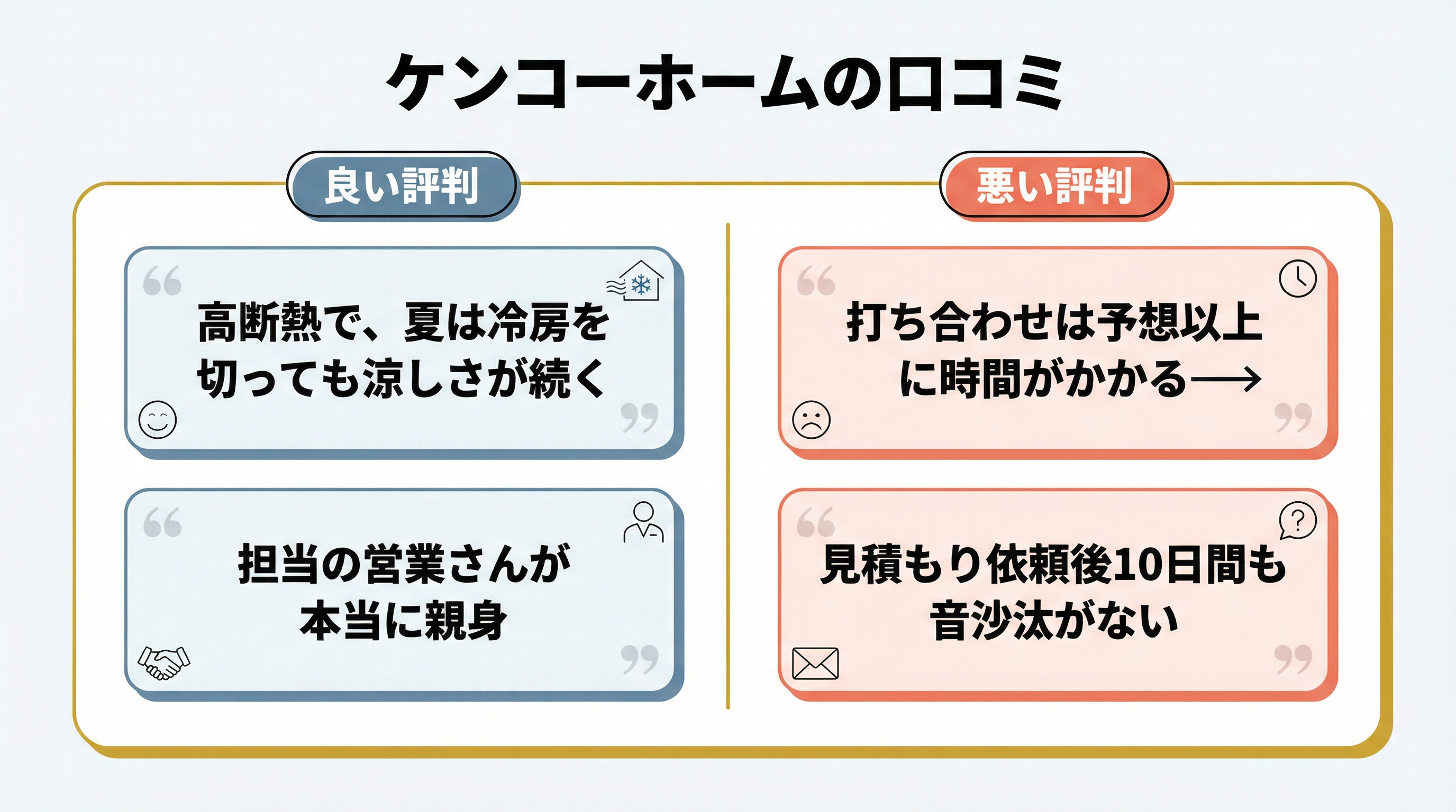 ケンコーホームで実際に家を建てた人の評判は気になりますよね?ネット上でも様々な意見が見られます。