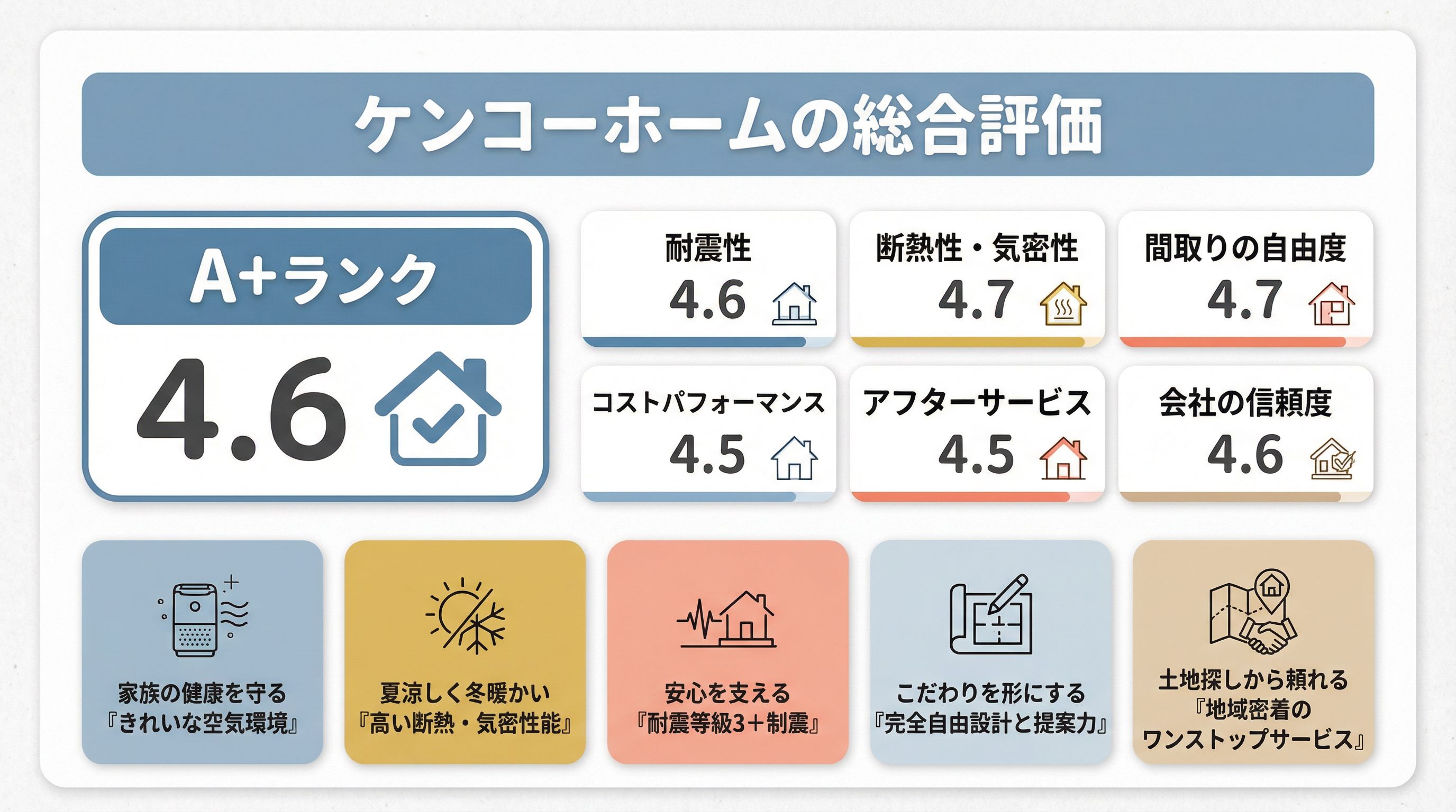 宅建士として総合的に評価すると、ケンコーホームは累計1000棟の施工実績に裏打ちされた確かな技術力を持つ信頼性の高い工務店です。特に、住宅性能における数値的な優秀さが実際の居住満足度に直結している点は、技術重視の施主にとって大きな魅力となるでしょう。