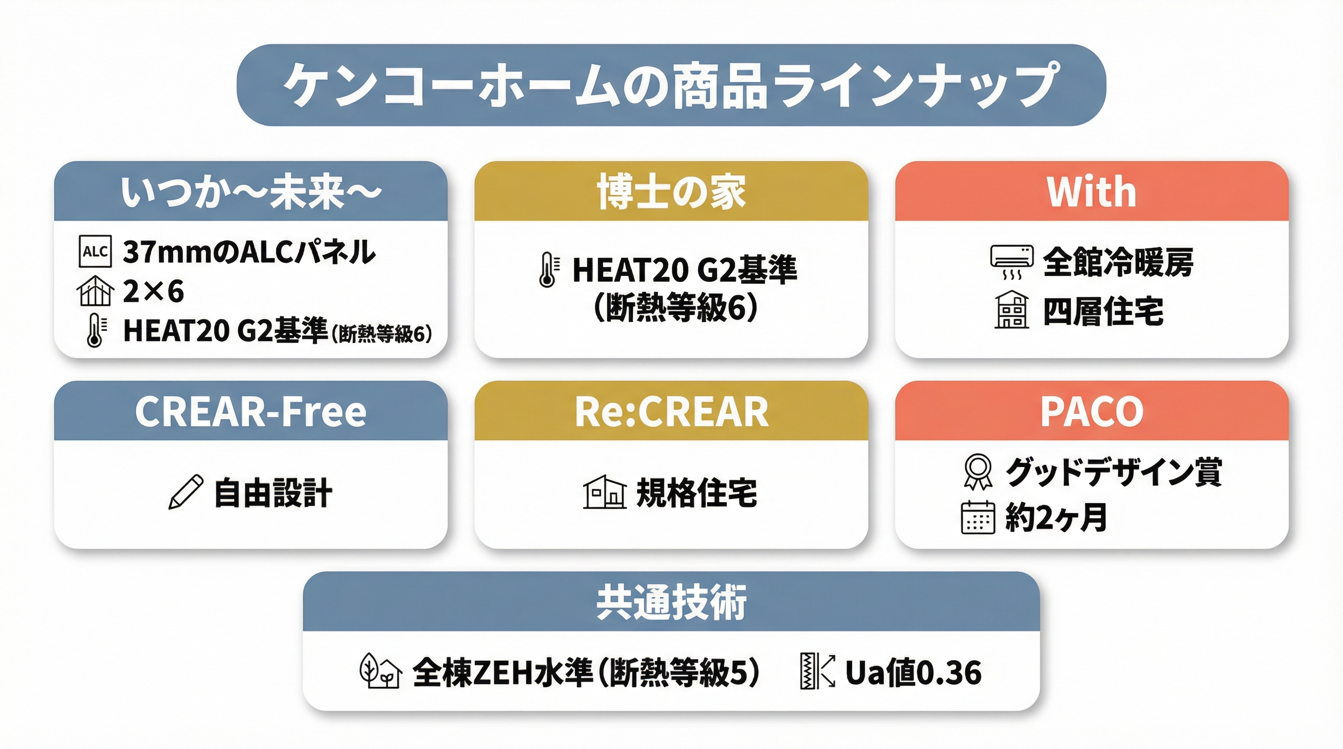 ケンコーホームでは、全棟ZEH水準(断熱等級5)の住まいを基本とし、お客様のニーズや予算に応じた多彩な商品展開を行っています。特に「冬暖かく、夏涼しい」ツーバイフォー(2×4)工法、高気密・高断熱を全商品の基盤としています。