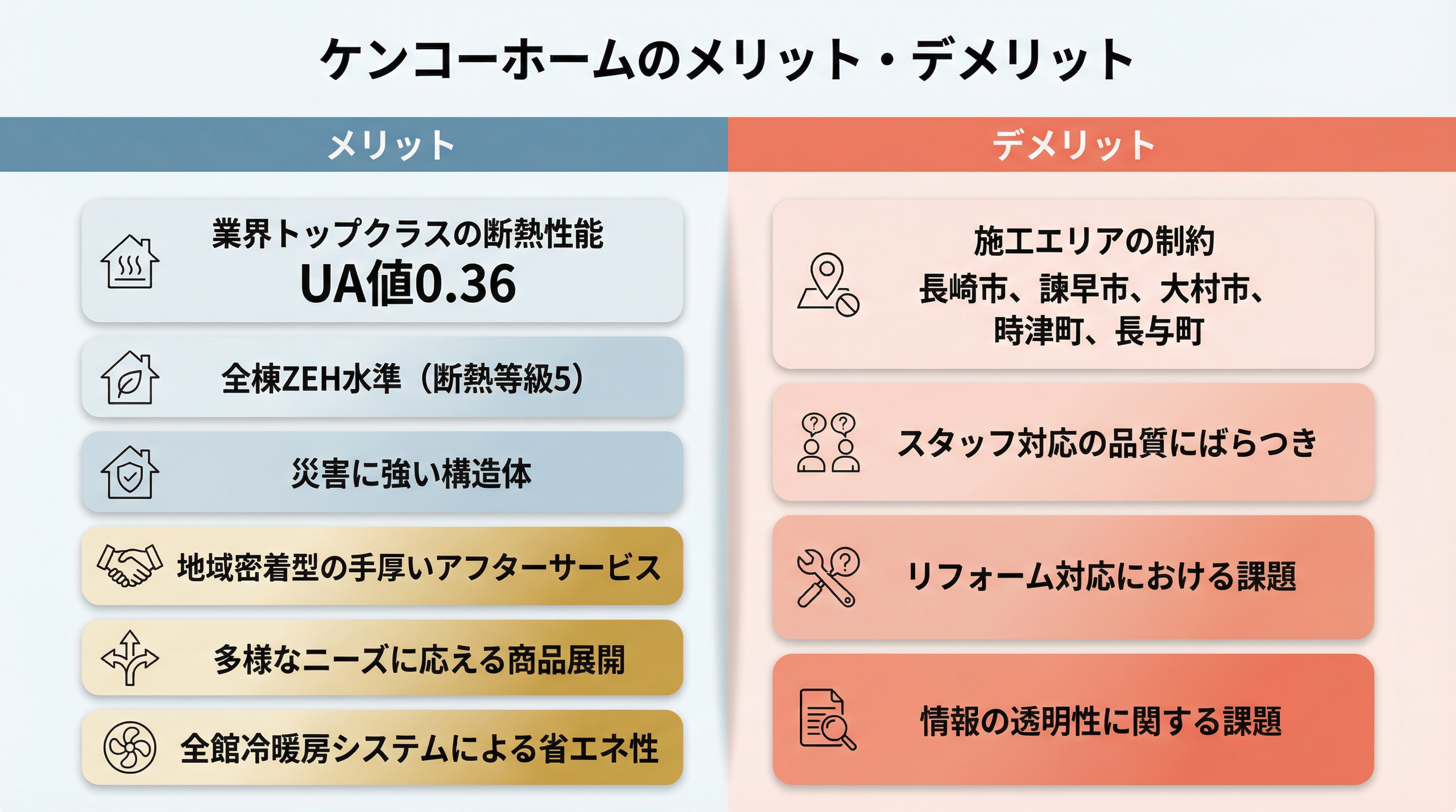 長崎県を拠点とするケンコーホームについて、これまでの情報を整理しながらメリットとデメリットという形で改めて解説していきます。また、ケンコーホームに向いている人、おすすめできない人の特徴についても触れているので、参考にしてみてください。