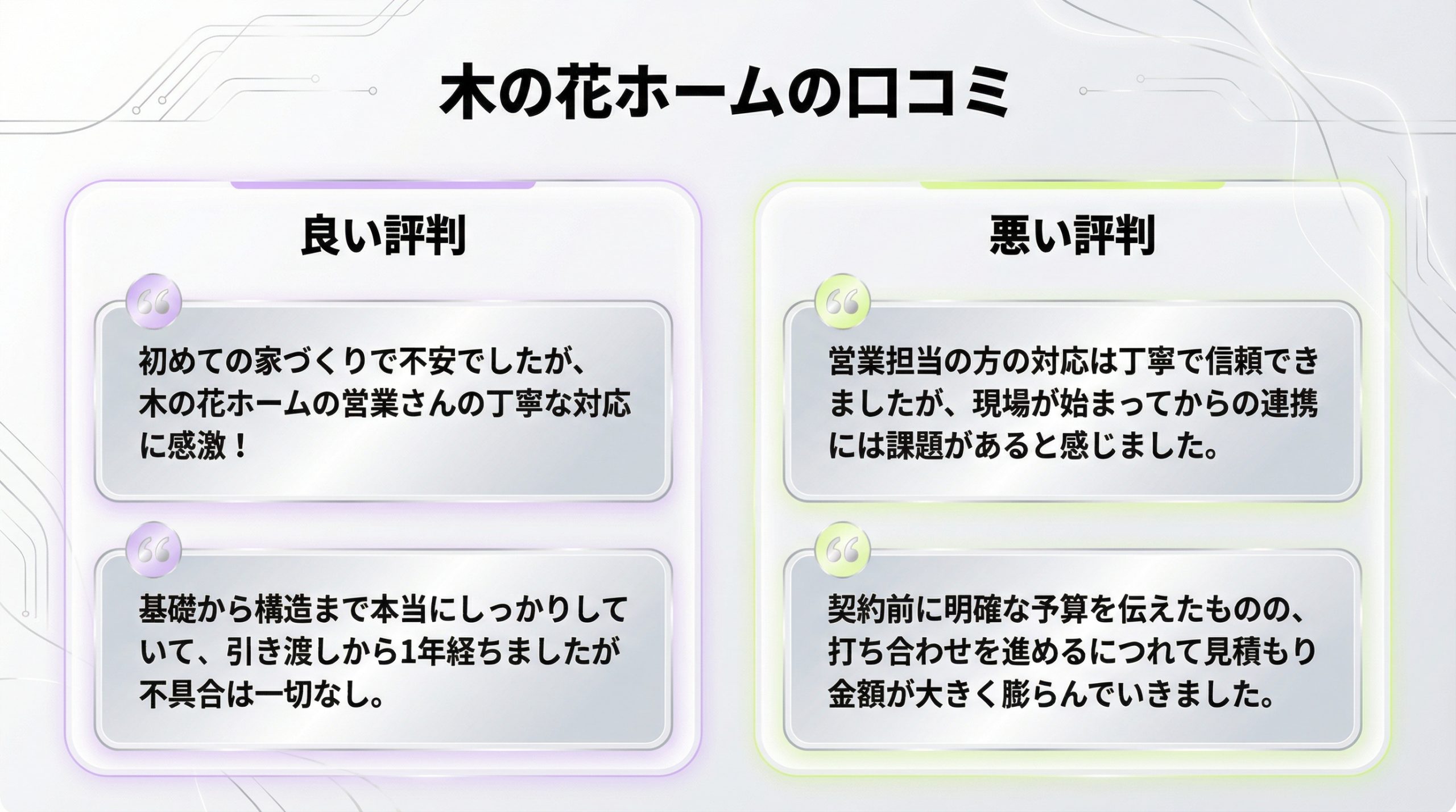 木の花ホームで実際に家を建てた人の評判は気になりますよね?ネット上でも様々な意見が見られます。