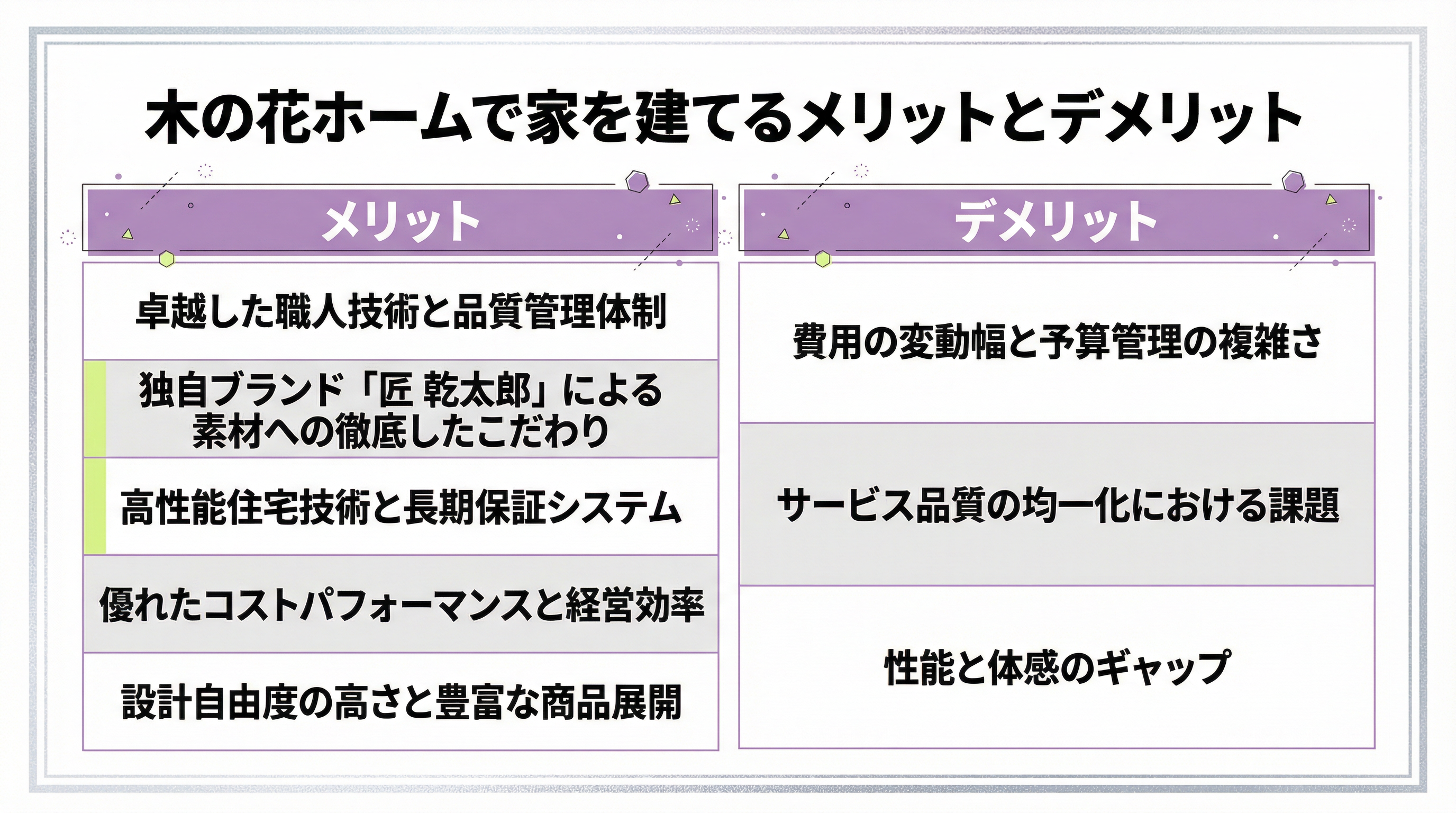ここでは、木の花ホームの具体的なメリットとデメリットを分析し、どのような方におすすめできるかを詳しく解説します。
