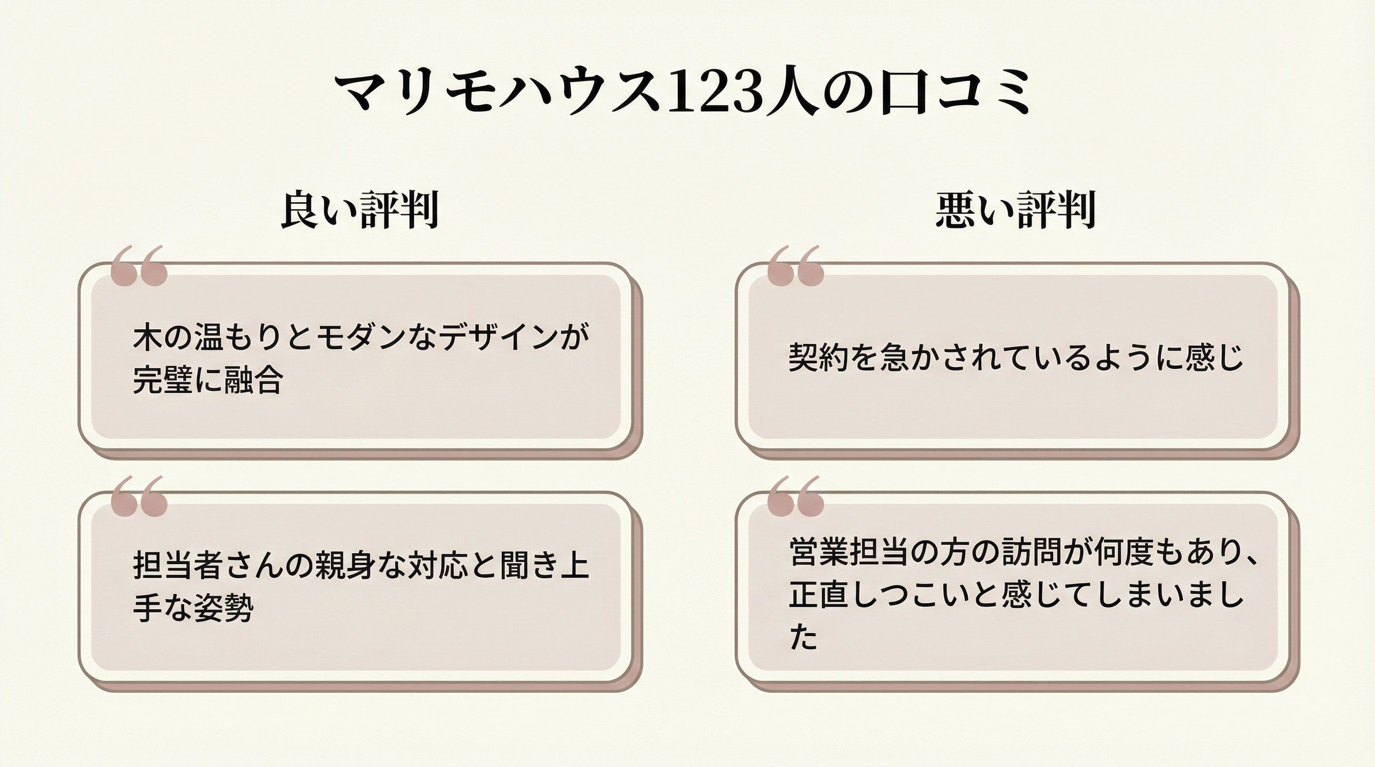 マリモハウスで実際に家を建てた人の評判は気になりますよね?ネット上でも様々な意見が見られます。