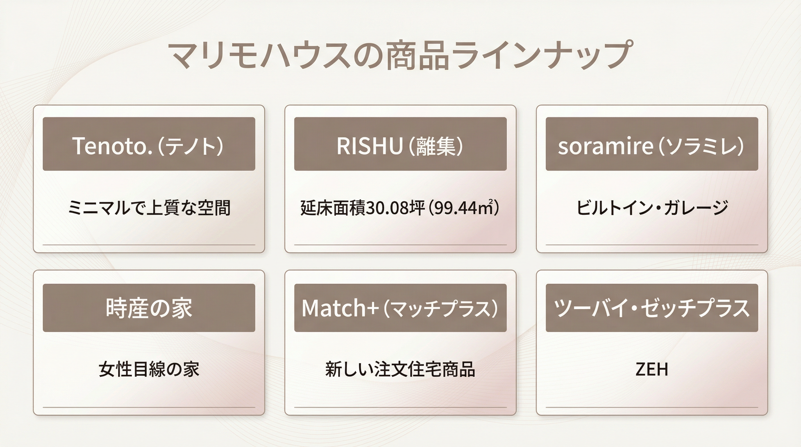 マリモハウスの商品は、従来の規格化された住宅ではなく、一人ひとりの暮らし方に合わせた真のオーダーメイド住宅として、多様なニーズに対応できる柔軟性と高い技術力を兼ね備えた商品体系となっています。