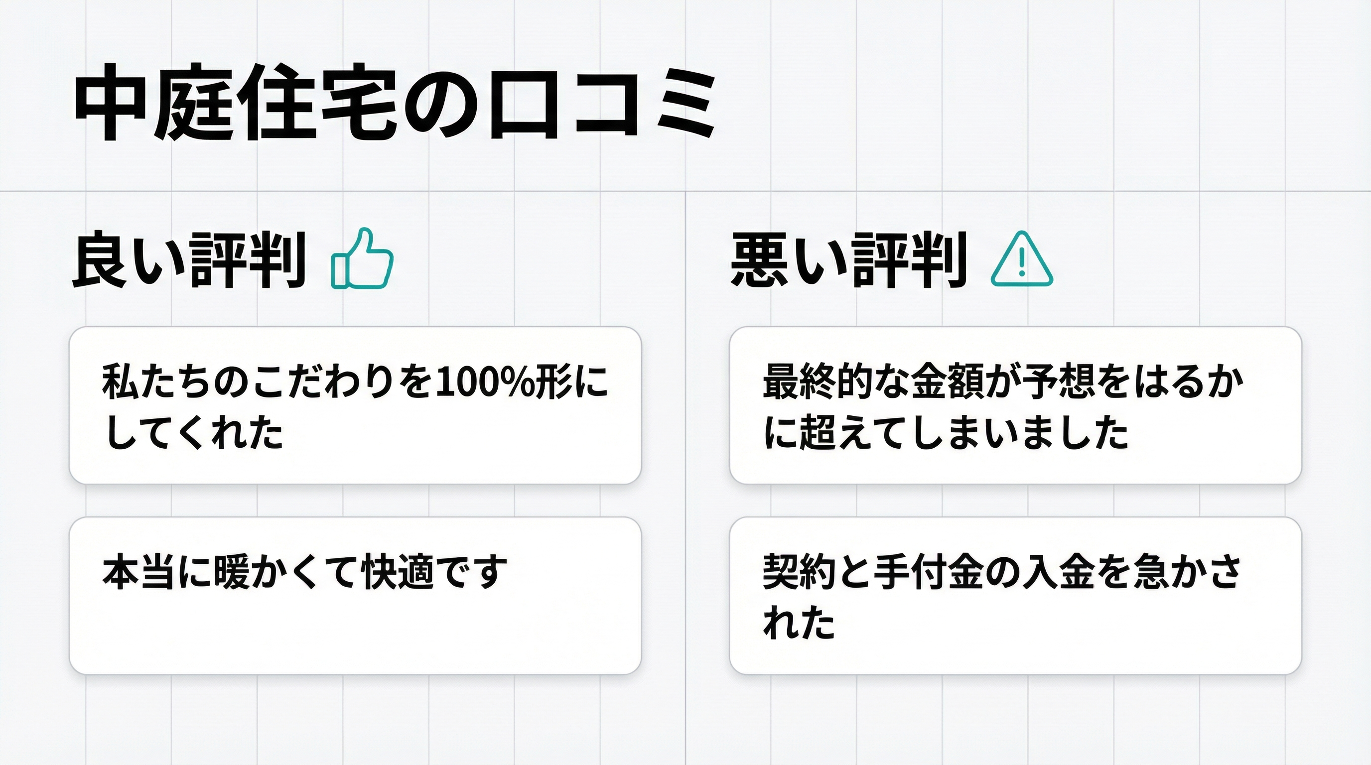 また、提案力のばらつきやアフターサービスの品質について一部で不満の声があります。こうした担当者によって対応の質に差があるという指摘は、多くのハウスメーカーで見られる傾向のため、中庭住宅に限って多い傾向ではありません。自分に合った担当者を見極めることが大切です。