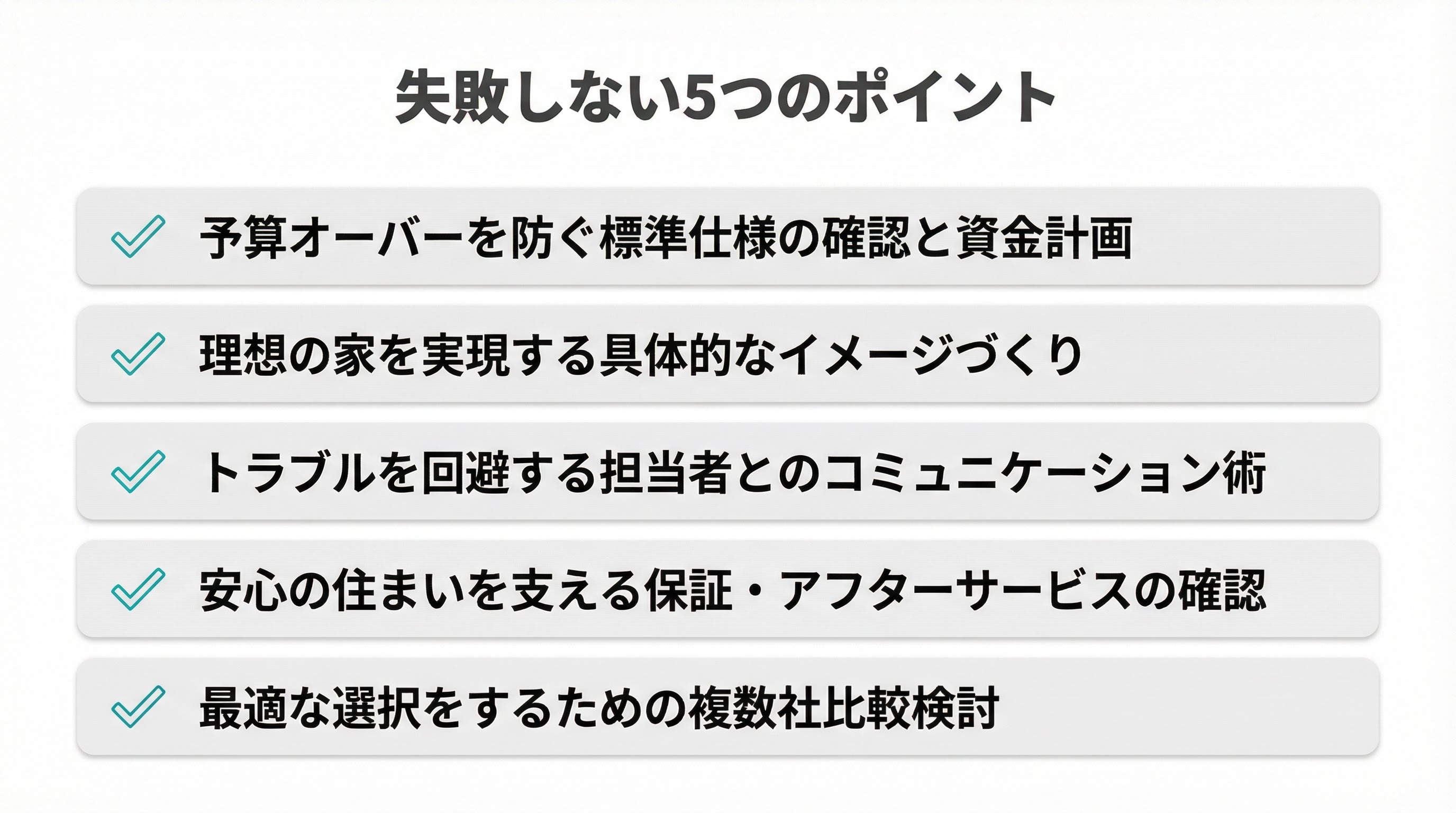 家づくりは一生に一度の大きなイベント。後悔のない選択をするために、以下の5つのポイントを参考に、家づくりを進めていきましょう。