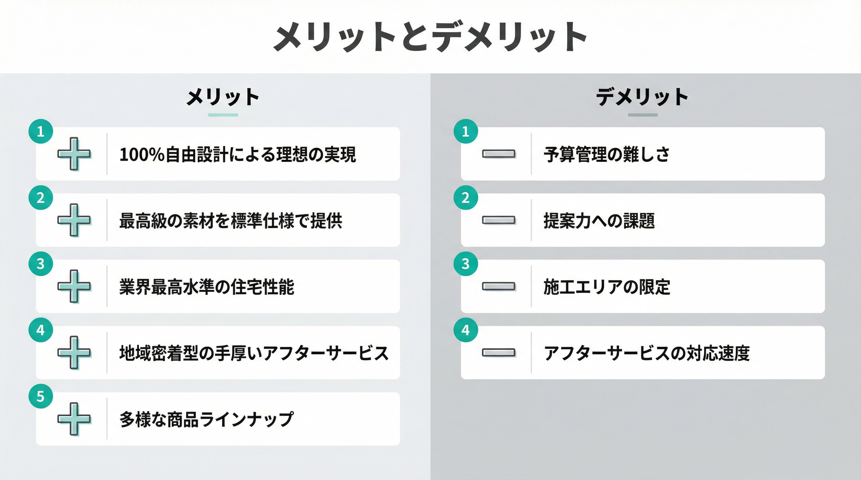 一方で、自由設計の特性や地域密着型メーカーならではの制約もあります。