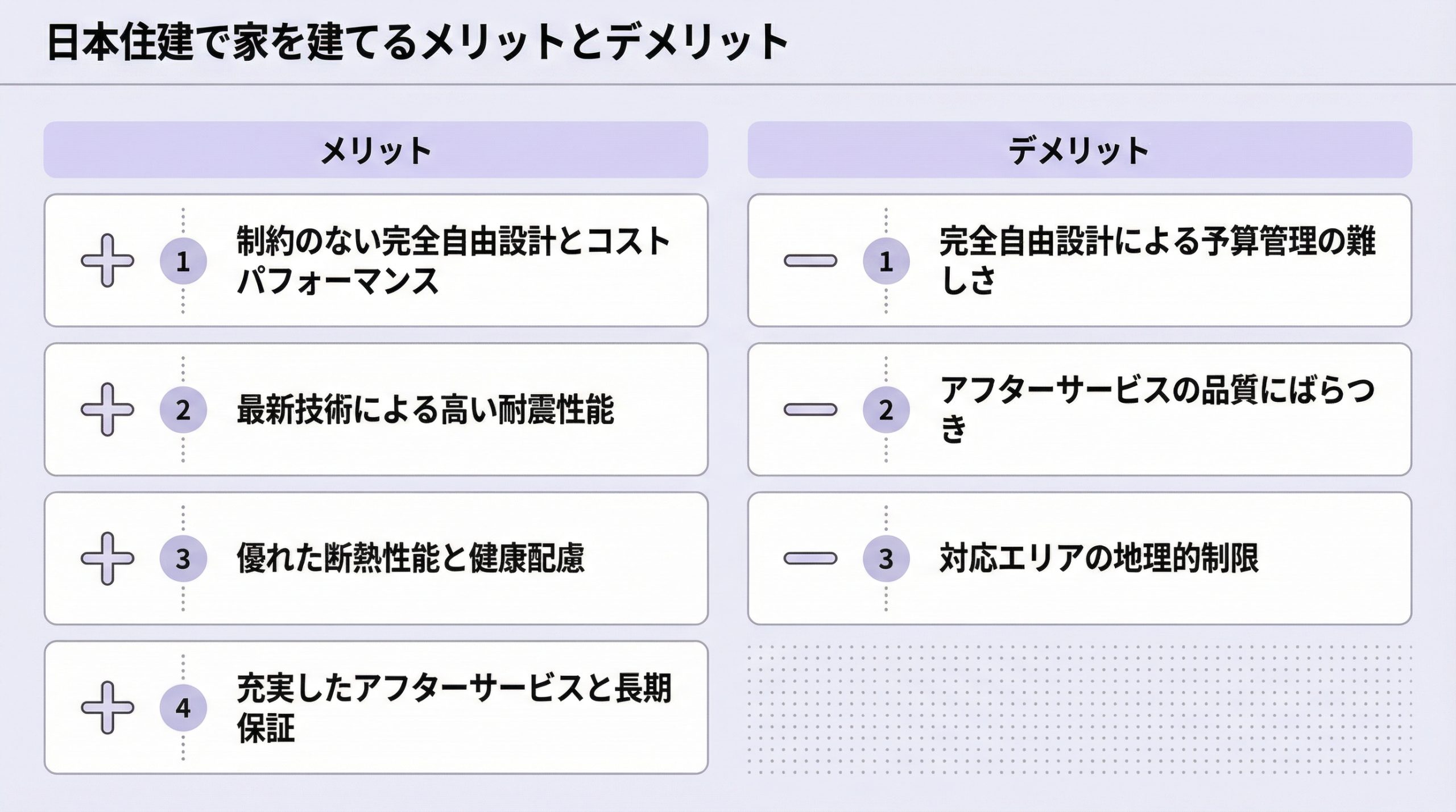ここでは、日本住建の具体的なメリット・デメリットと、どのような方に適しているかを詳しく解説します。