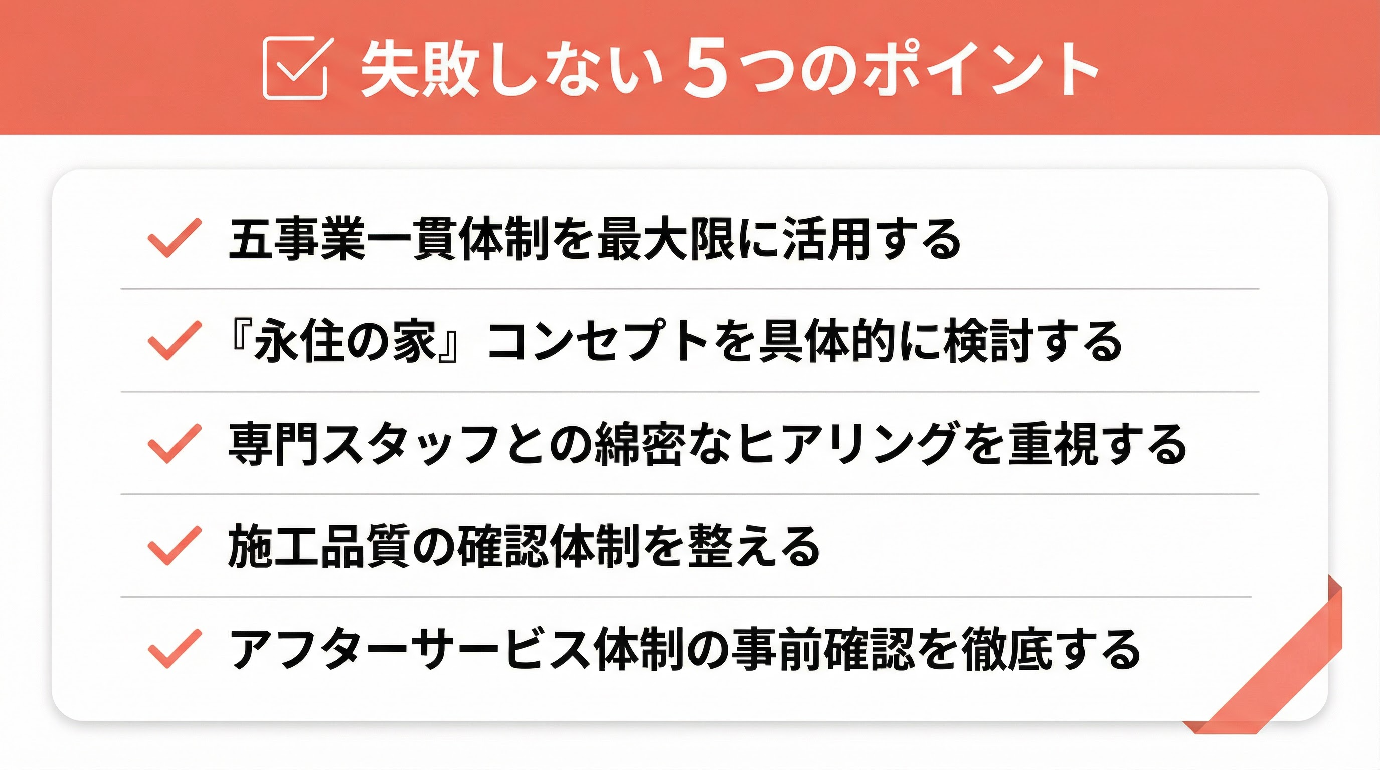 家づくりは一生に一度の大きなイベント。後悔のない選択をするために、以下の5つのポイントを参考に、家づくりを進めていきましょう。
