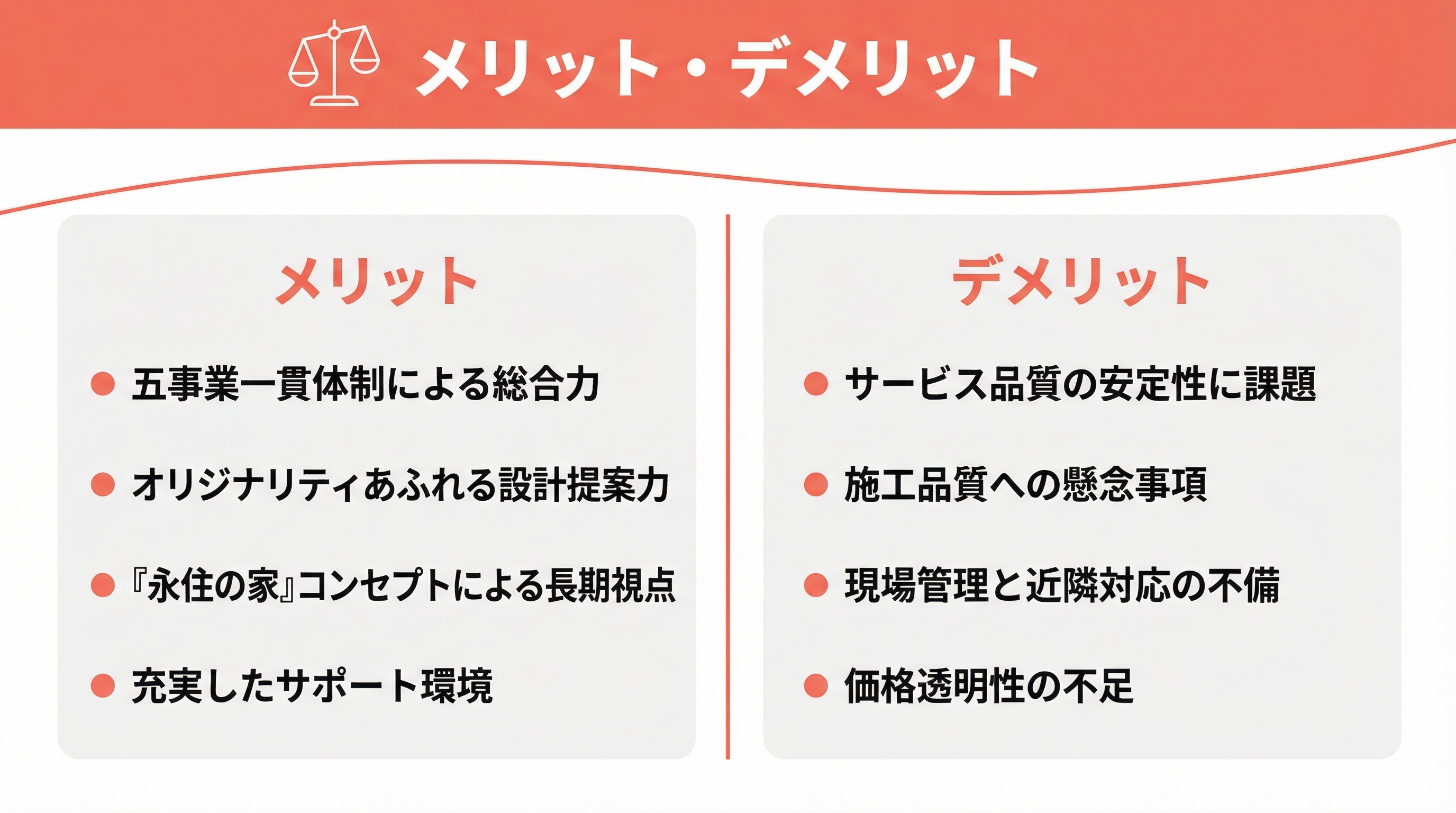 離職率の高さや組織運営に関する内部からの指摘があるため、企業の安定性や継続性を重視する方には懸念材料となります。長期にわたるアフターサービスを考慮すると、企業体制の安定性は重要な要素です。