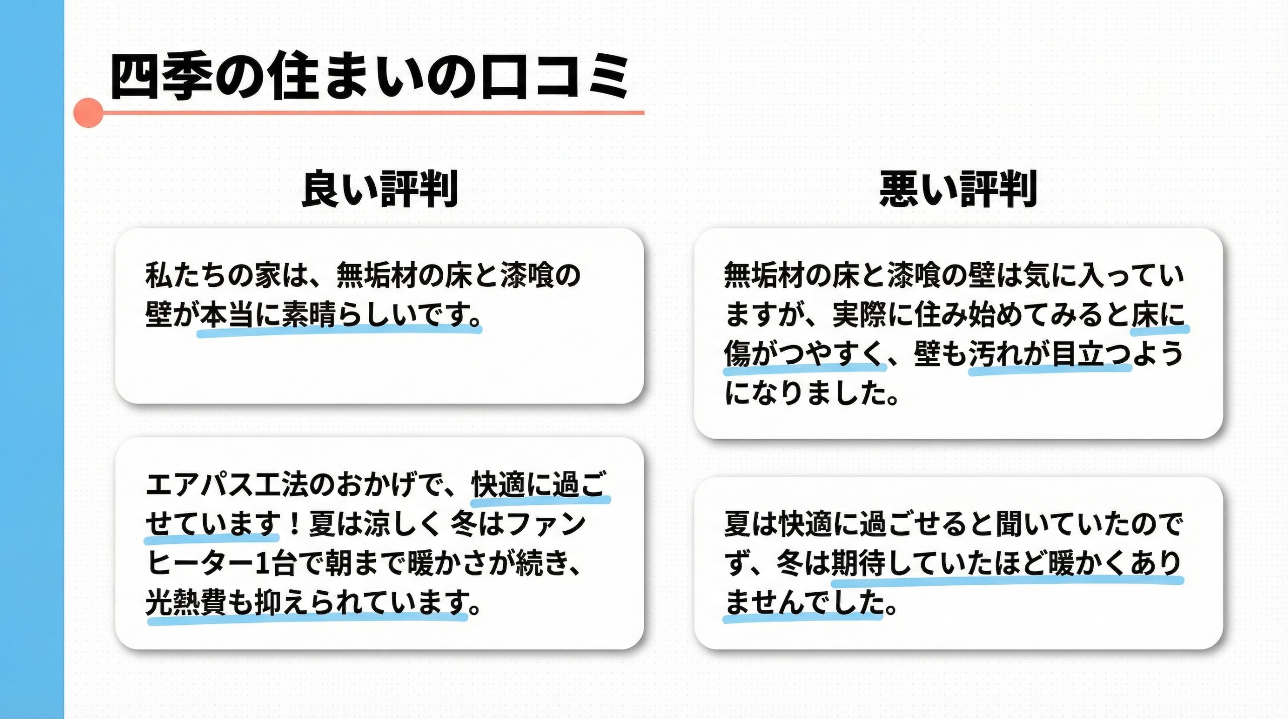 四季の住まいに対する肯定的な評価は、自然素材とパッシブデザインの技術力に集約されています。