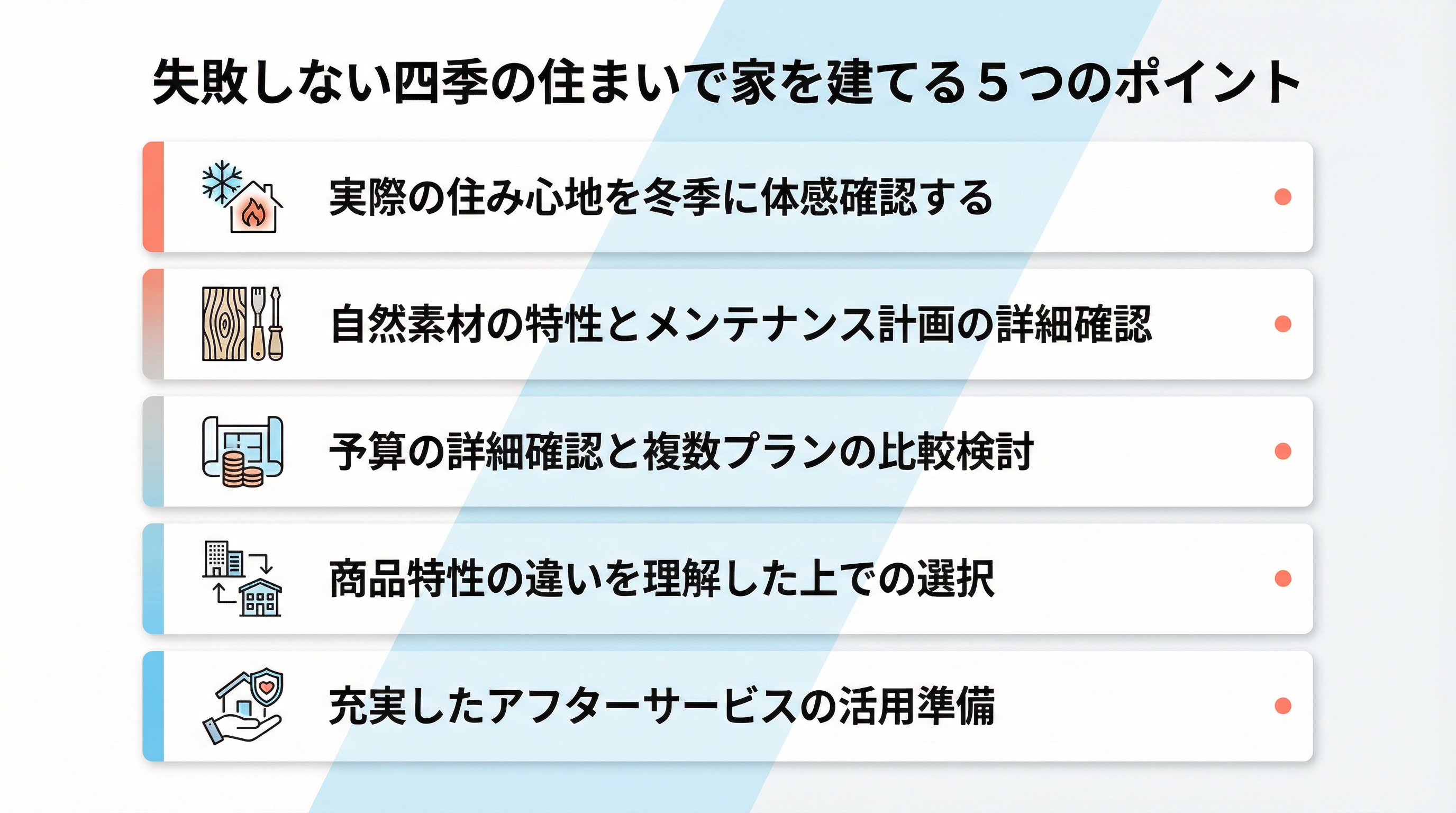 家づくりは一生に一度の大きなイベント。後悔のない選択をするために、以下の5つのポイントを参考に、家づくりを進めていきましょう。