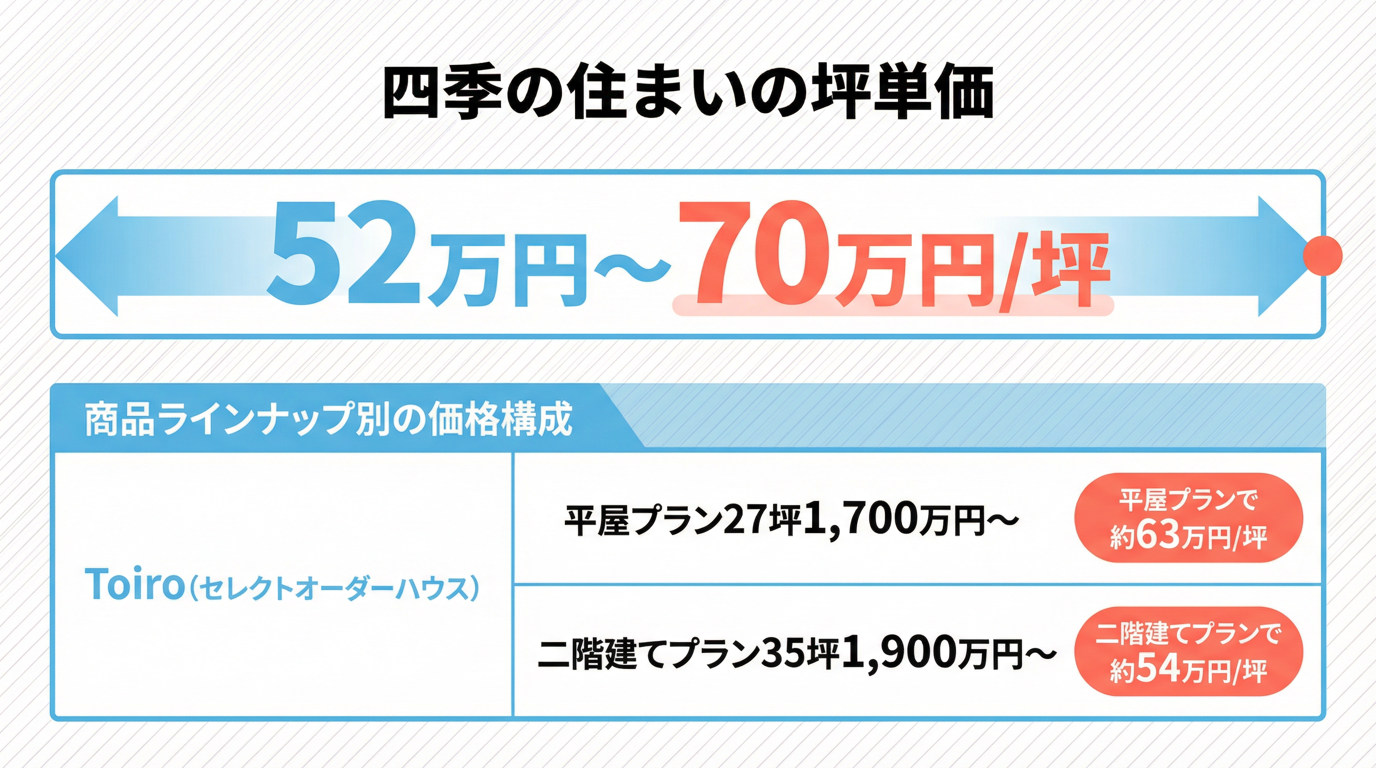 Toiroでは平屋プラン27坪1,700万円~、二階建てプラン35坪1,900万円~という明確なパッケージ価格を設定し、ノルディック、ナチュラル、ヴィンテージの3つのデザインテイストから選択できます。坪単価は約52万円~70万円が目安で、1,000万円台からの住宅建築も可能です。