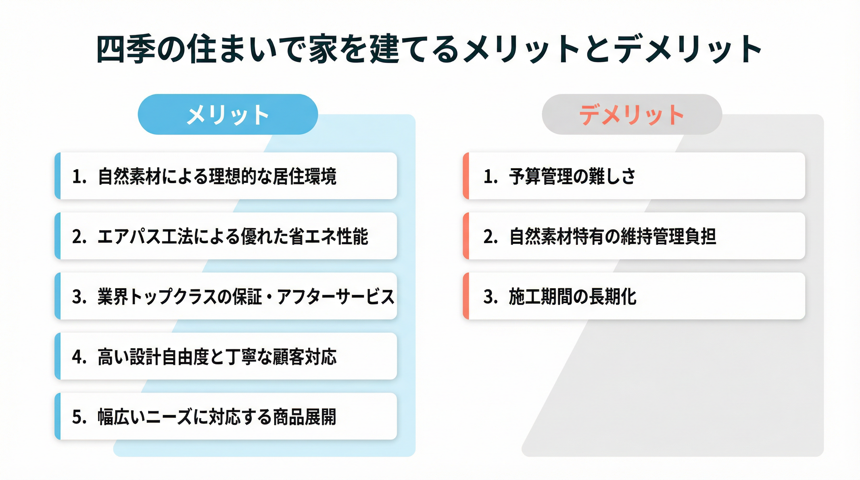 ここでは、四季の住まいのメリット・デメリットを詳しく解説し、どのような方に向いているかをご紹介します。