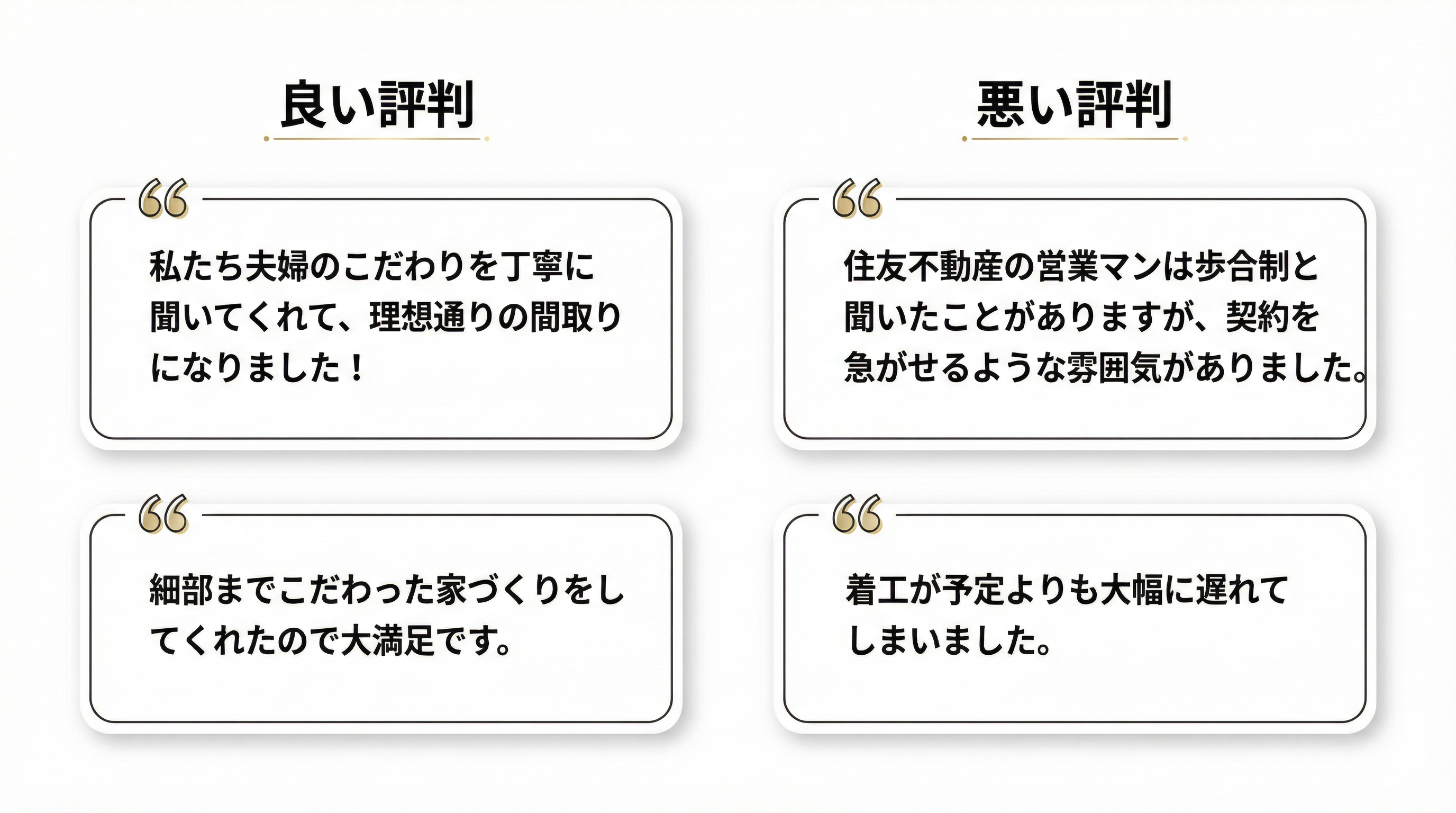 住友不動産で実際に家を建てた人の評判は気になりますよね?ネット上でも様々な意見が見られます。