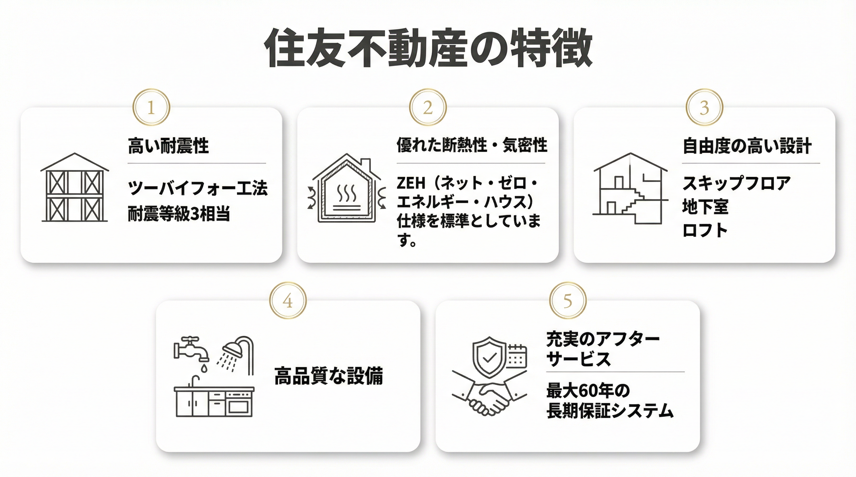 住友不動産は、高品質な標準仕様、優れた耐震性、高い省エネ性能など、質の高い住宅を求める人に最適です。標準仕様で、高級マンション仕様のキッチンやバスルーム、トイレなどを採用しており、快適な暮らしを実現できます。