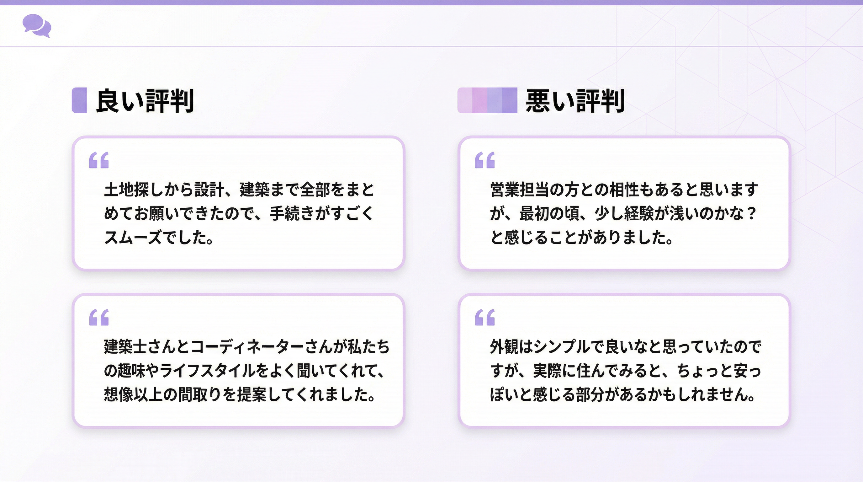 「親身に対応してくれた」「要望を丁寧に聞いてくれた」という好意的な口コミがある一方で、「スタッフのレベルが低い」「提案力に欠ける」「打ち合わせ内容が反映されない」「営業スタッフの対応が契約前と後で変わった」といった声も見られます。担当者によって知識、経験、接客態度に差があることが窺えます。