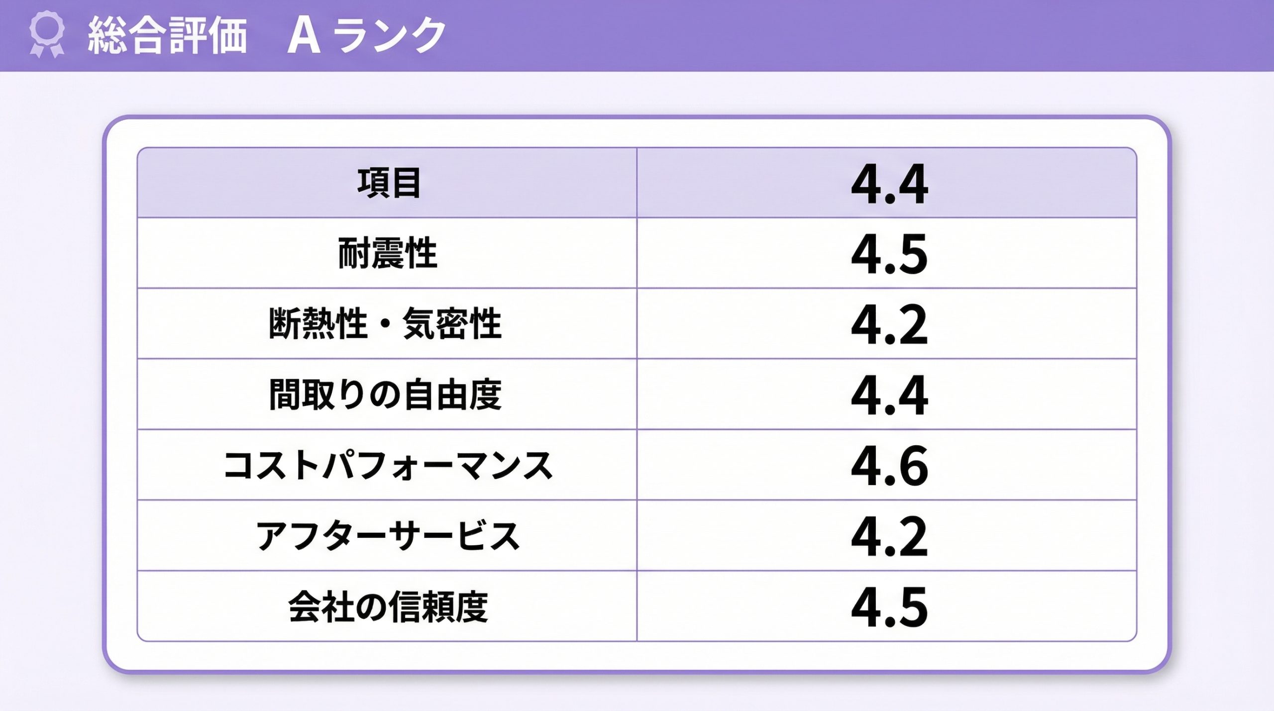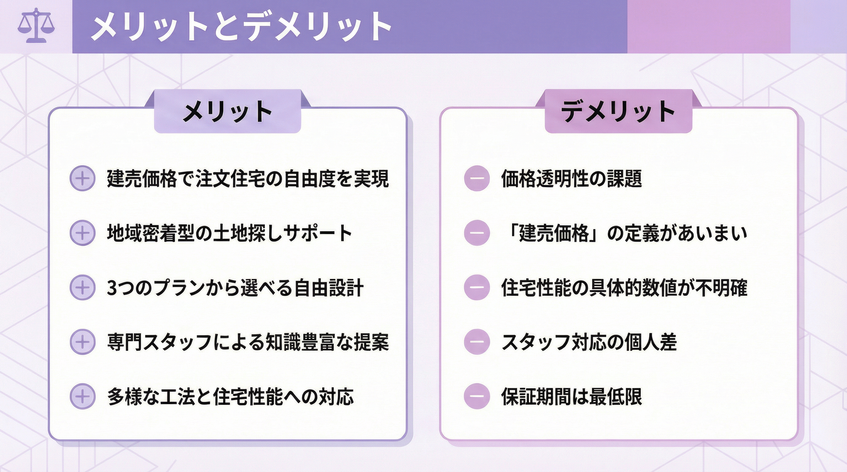 初期保証が品確法の最低基準である10年間にとどまる点は、長期保証を求める方には物足りないでしょう。30年保証などの長期保証プログラムを提供する大手ハウスメーカーと比較すると、この点は見劣りします。「住宅は一生に一度の買い物だから、長期間の安心が欲しい」という方には、保証プログラムが充実した他社も検討の余地があります。