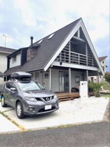 G-LOGなつは、空に向かって伸びる三角屋根が大きな特徴のログハウスです。