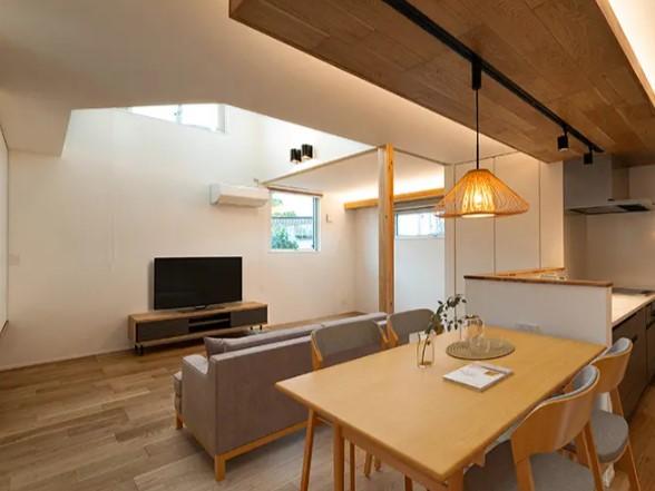 角地の性質を利用し、吹き抜けから光を多く集め、リビングに明るい光がさしこむように計算されているのが特徴です。