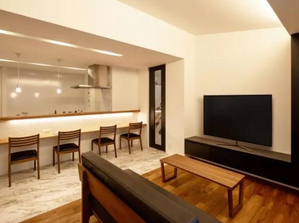 メインの床に大理石調タイルを採用し、チークの無垢フロアで上質な空間を演出しています。