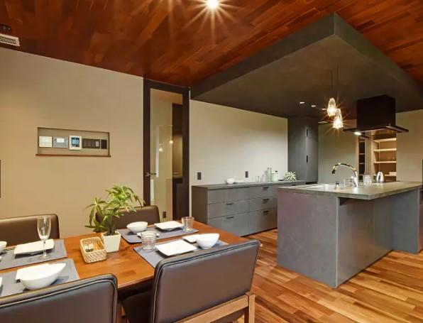 天井にチーク材を使用し、床の色味と統一し、リクシルの最上位グレードのキッチンを採用。
