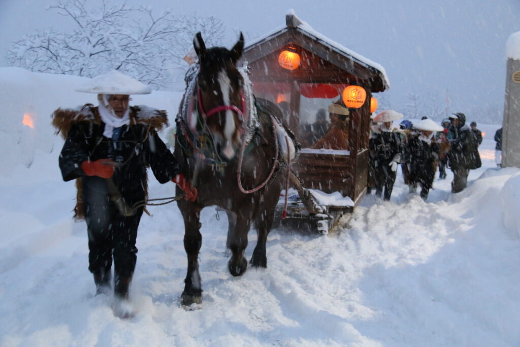 冬の峠を越えて嫁入りを行っていた当時の様子を再現するため、和服に身を包んだ新郎新婦が馬そりに揺られながら町の中心部から山間部までの約12㎞の道のりを練り歩きます。