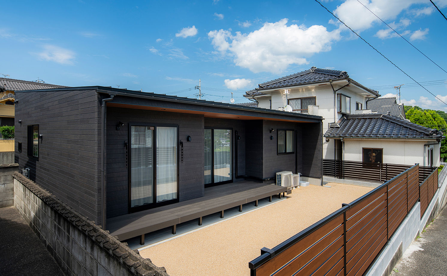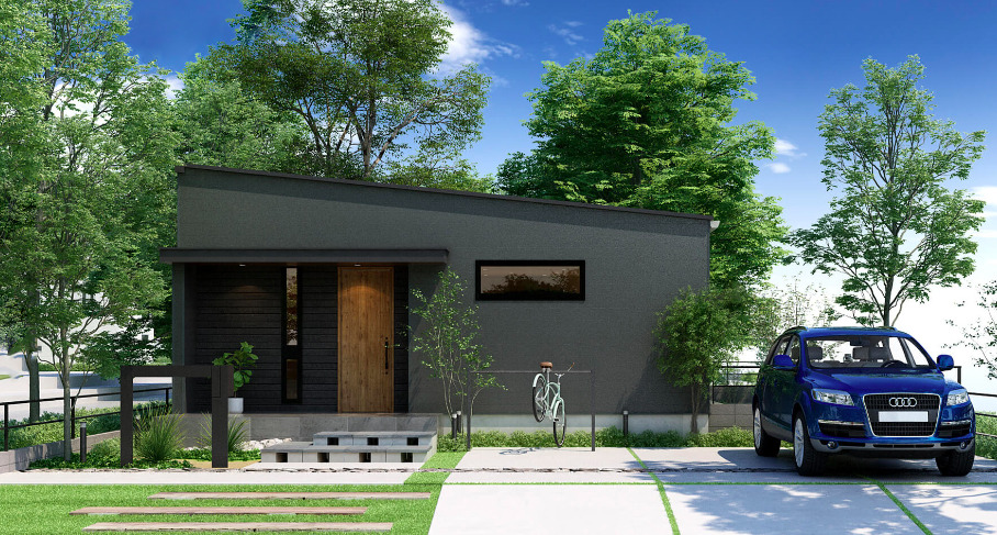 黒を基調とした外観の平屋住宅は、目を引く存在感があります。