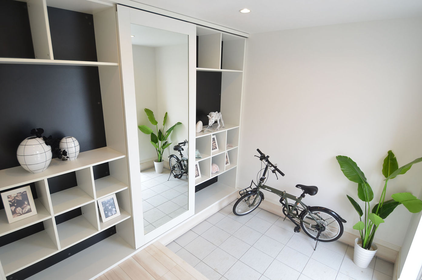 玄関ホールには大きな姿見と見せる収納が設置されており、インテリアを飾るスペースとして利用できます。