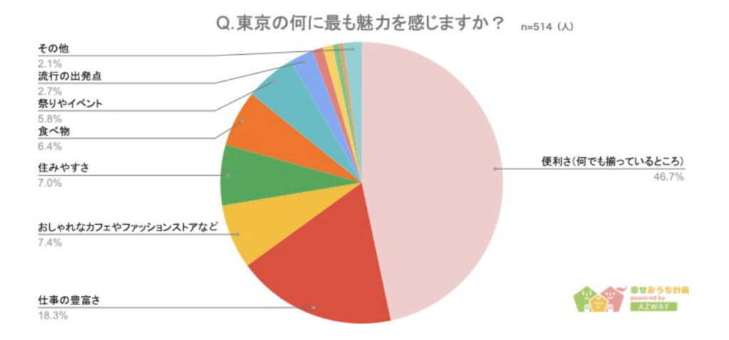 最後に、「東京の魅力」について聞いたところ、「便利さ」が240人(46.7%)で1位という結果になりました。交通の利便性はもちろん、少し歩けばなんでも揃う手軽さに魅力を感じている人が多いとわかります。また、2位は「仕事の豊富さ」で94人(18.3%)、3位は「おしゃれなカフェやファッション」で38人(7.4%)となっており、キャリアアップをしたい人や流行を楽しみたい人が多いことがわかりました。