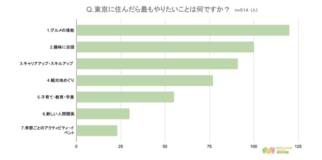 東京に住んだらしたいこと1位は、「グルメの堪能」という結果になりました。流行の最先端である東京で、食を堪能したい人が多いことがわかります。また、趣味に没頭したいという意見も上位にランクイン。東京ではコンサートやイベントが多く、簡単に行けるアクセスの良さに魅力を感じている人が多いと言えるでしょう。