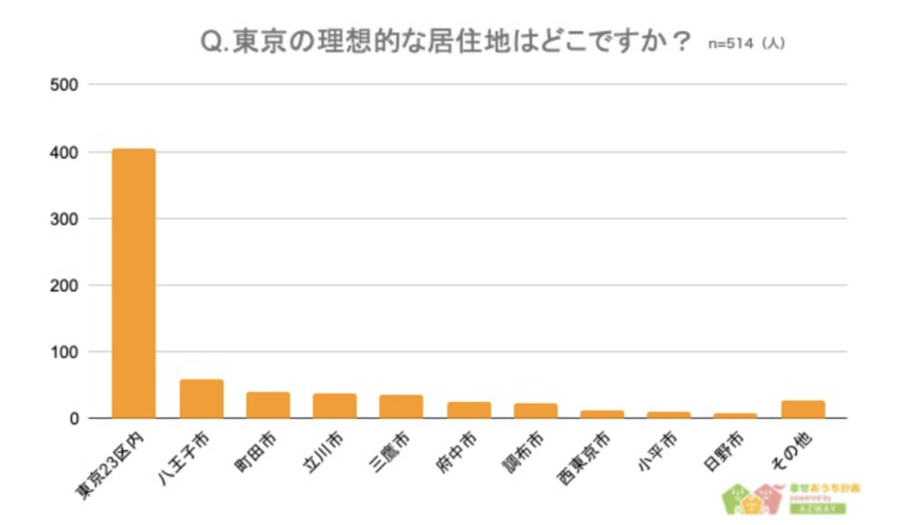 続いて、「東京に住む際の理想的な居住地」について聞いたところ、「東京23区内」が405人で1位という結果に。山手線や中央線など、メジャーな路線が通っている利便性の高さに人気が集まっています。
