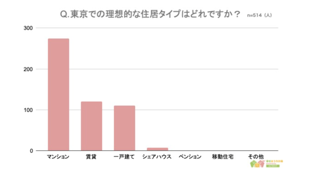 「東京の理想的な住居タイプ」では、マンションが274人で1位、賃貸が120人で2位、一戸建てが110人で3位という結果になりました。人口が集中し土地に限りのある東京では、マンションを希望する人が多いことがわかります。